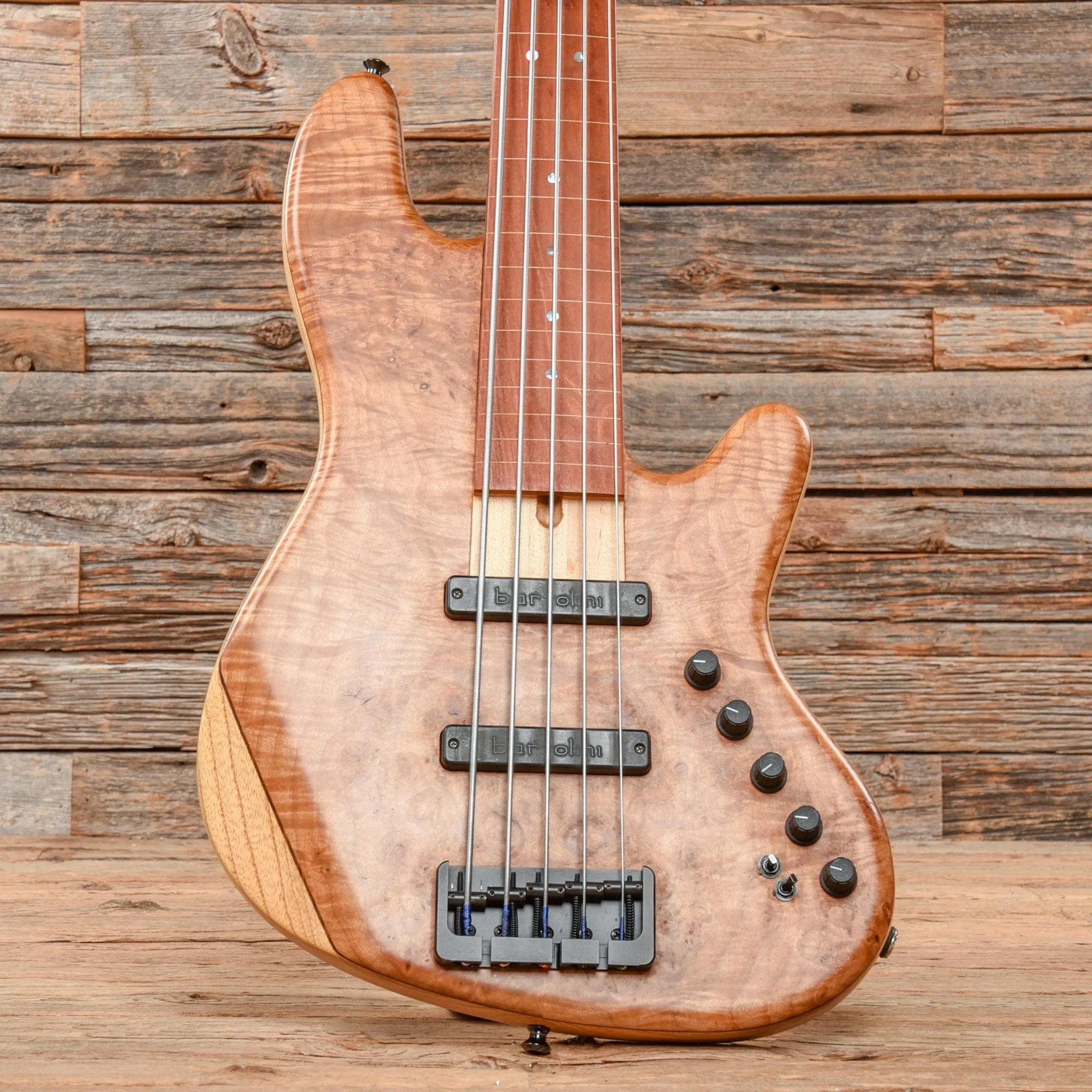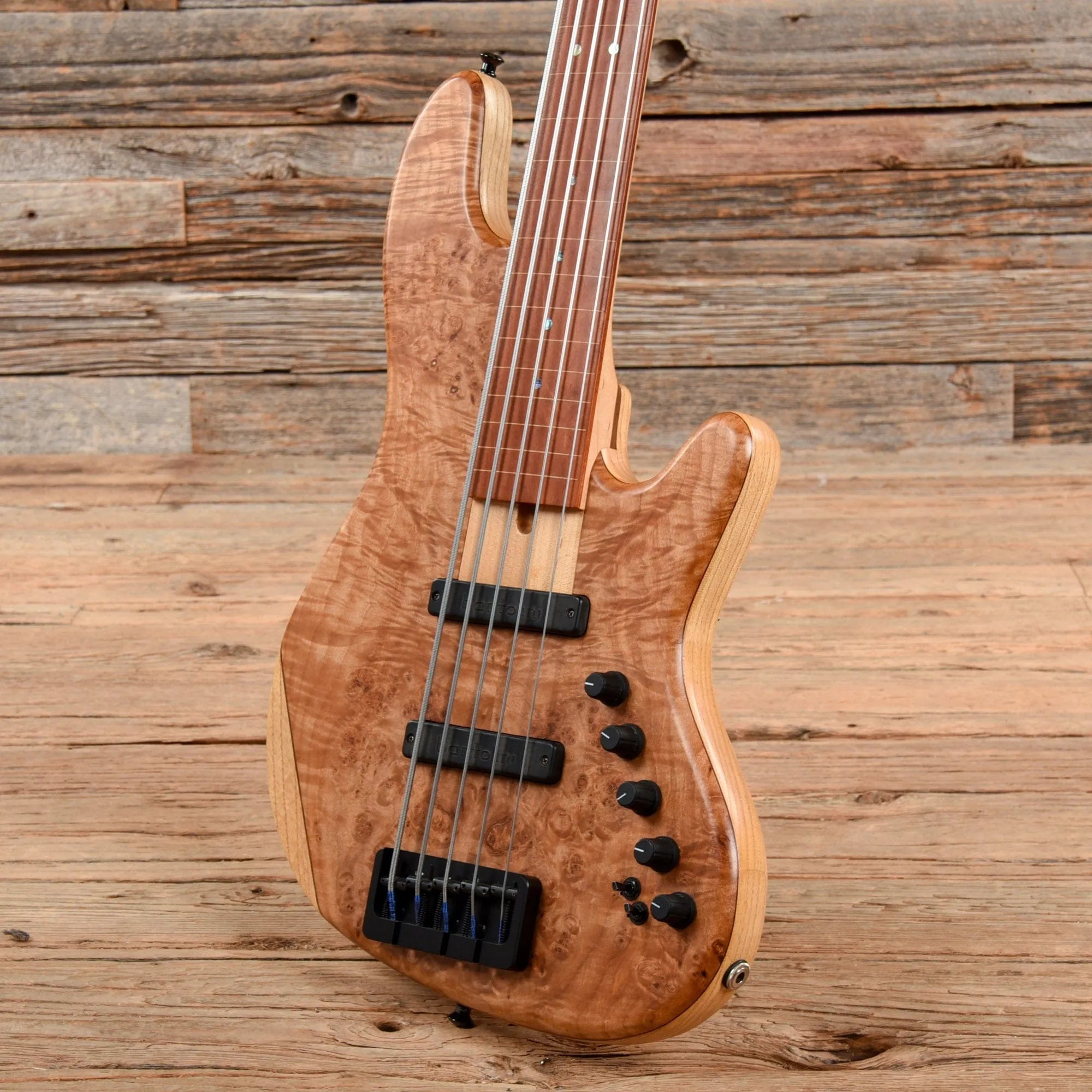Neck Details: 3 pc. Bolt On Maple neck. Walnut heel transition. Pink Ivory fretless fingerboard. Maple lines. Pearloid face dots. White pearl side dots at the note. Double black side dots at 12 and 24. Pink Ivory nut. Truss rod access at heel. Matching Maple Burl/Black Veneer headstock cap.