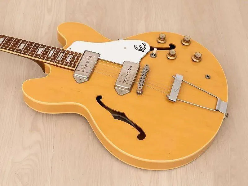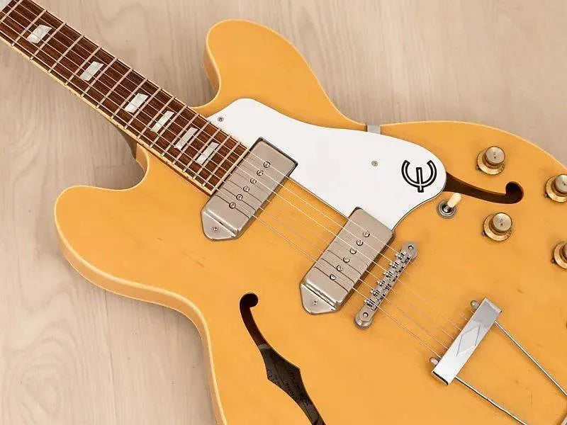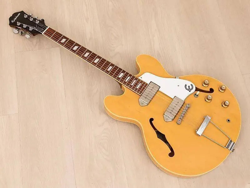 A true gem for vintage tone lovers — this 2009 Epiphone Elitist Casino 1965 reissue in Natural finish offers premium craftsmanship made in Japan. Featuring USA-made Gibson P-90 pickups, a fully hollow maple body, and classic vintage-style appointments, it delivers rich resonance and iconic Beatles-era tone. Lightweight, responsive, and a joy to play. Find rare, vintage, and high-end guitars at The Guitar Rescue. Shop iconic instruments at amazing prices today!