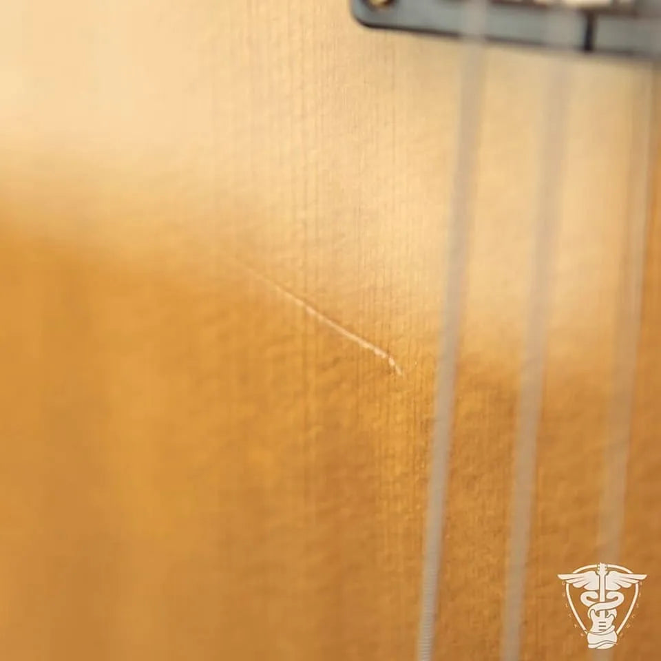Neck/Headstock: Two small surface cracks in headstock binding. A couple of tiny surface cracks in neck binding.