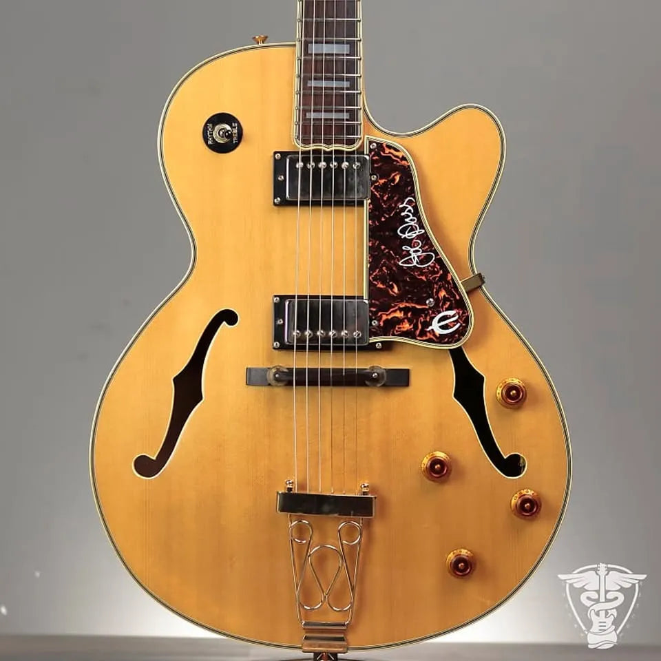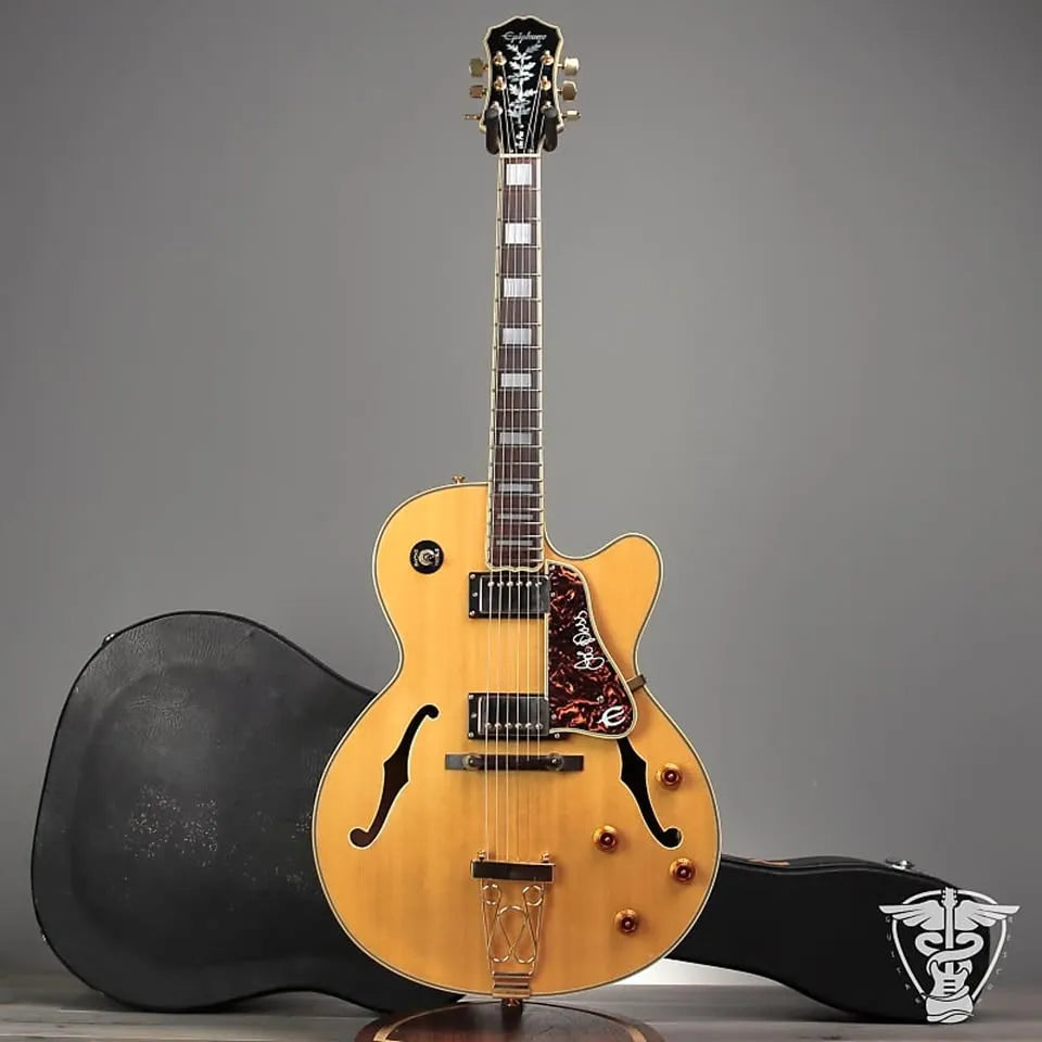The Epiphone Joe Pass Signature Emperor II 1994 – 2015 features a Spruce Top, slim taper “C” profile maple neck, and a truss rod cover with “Joe Pass” inscription.