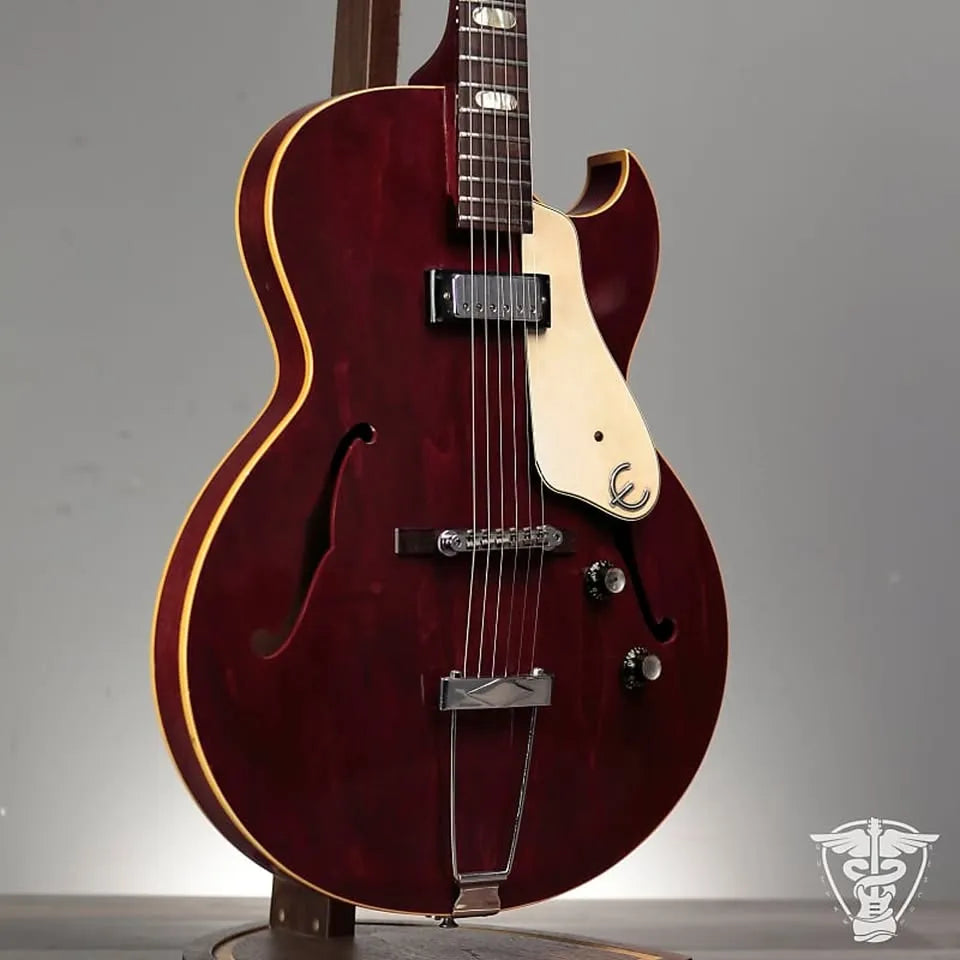 The Epiphone Sorrento was a thinline electric acoustic guitar, produced by Gibson at their Kalamazoo factory during the 1960s. It was, in many ways, an equivalent model to the Gibson ES-125TC and ES-125TDC; many Gibson instruments had an Epiphone version, and some, like the Sorrento, were very similar indeed. But the Sorrento was also very similar in style to a slightly earlier Epiphone, the Epiphone Windsor, first shipped in 1959, though without the Windsor’s gold-plated hardware.