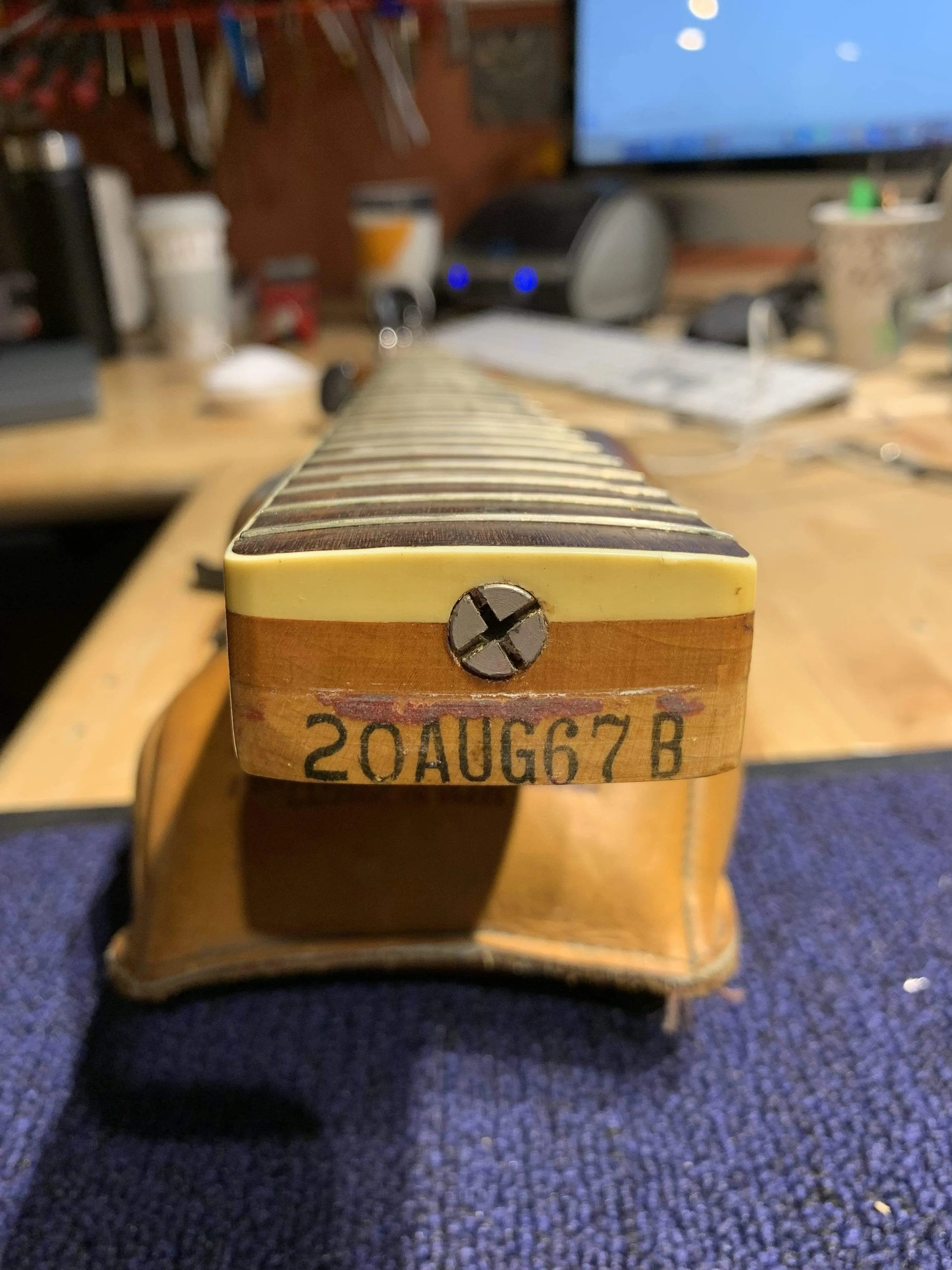 Neck Details: Bolt-on maple neck with bound rosewood fretboard, block inlays, and heel-adjust truss rod. The neck heel has a “20 AUG 67 B” stamp.