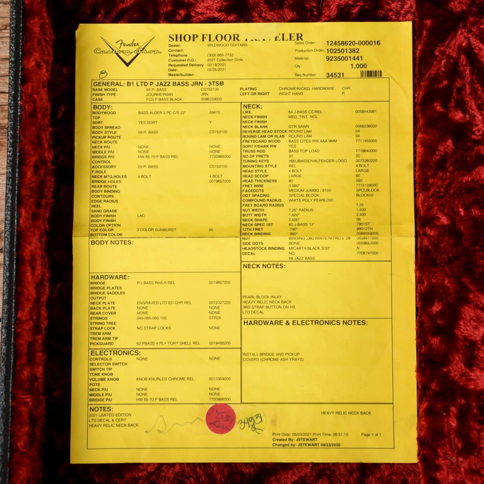 Tech Notes: This P Jazz bass plays well with low action and optimal neck relief. The frets are tall and show light play wear. It has been properly setup and intonated in standard tuning with flat wound strings.