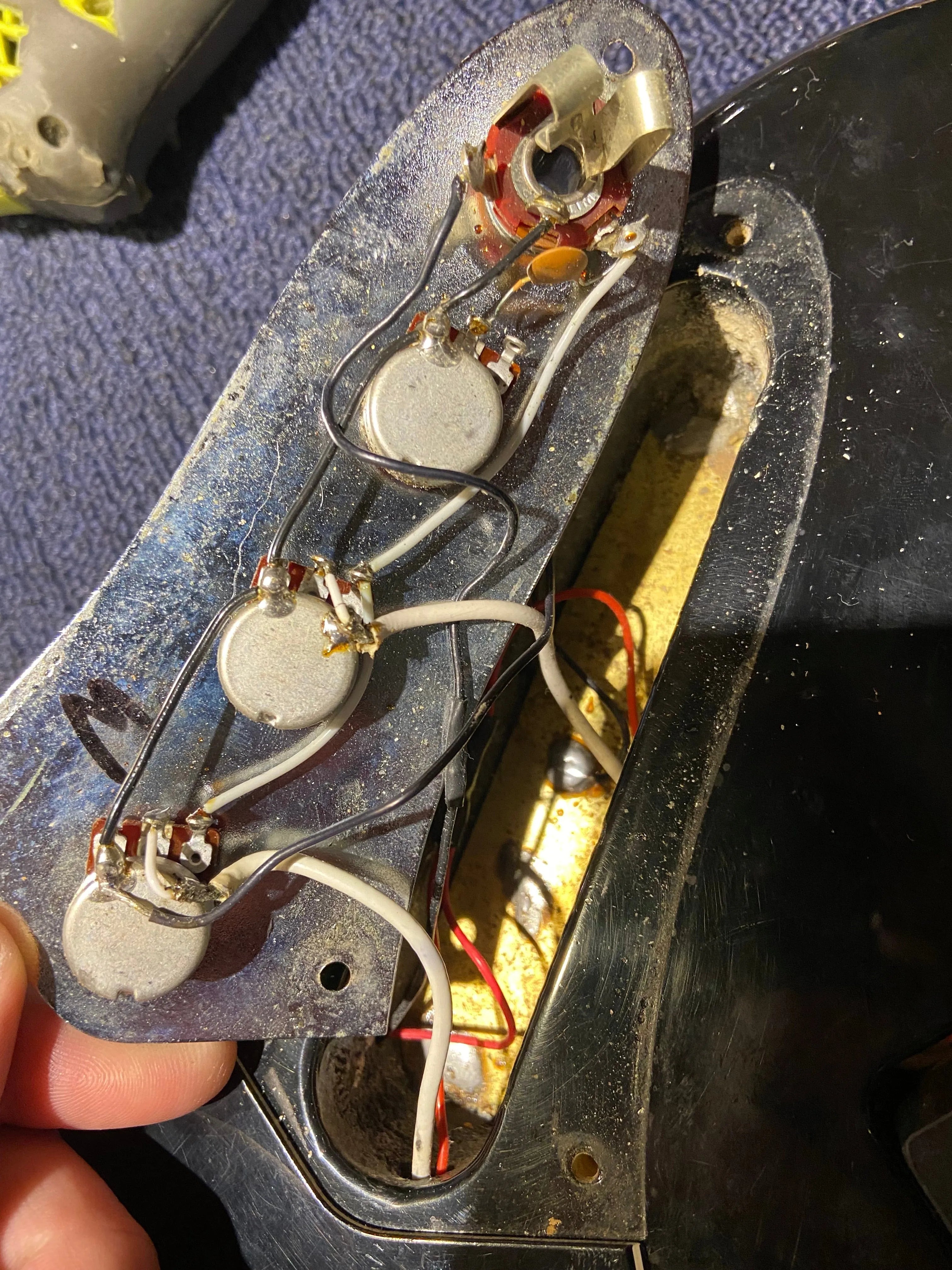 Modifications/Repairs: The electronics have been replaced, and the body has been modified with a battery compartment route. The thumb rest, and covers have been removed. The bridge cover mounting holes have been plugged.