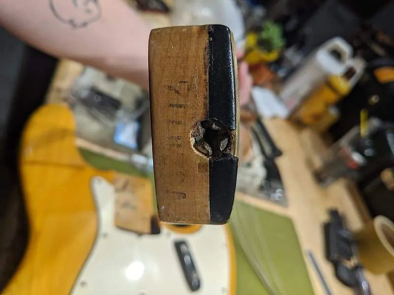 Neck Details: One piece maple bolt-on neck with skunk stripe and bound maple fingerboard. -1971 neck heel stamp.