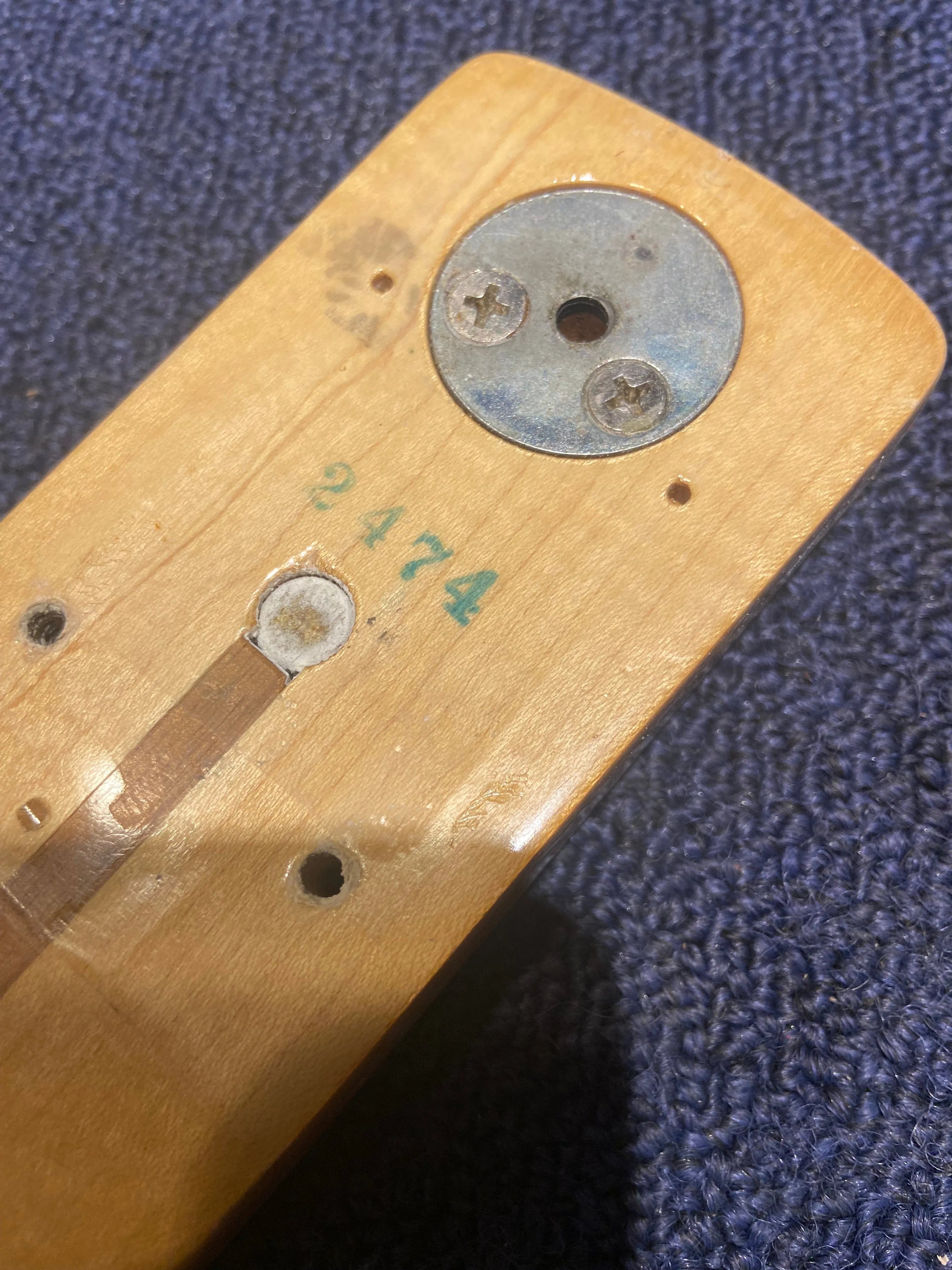Neck Details: Maple neck with bound maple fingerboard. Truss rod has limited adjustability. Serial number on headstock dates to 1977. “2427” stamp on back of heel.