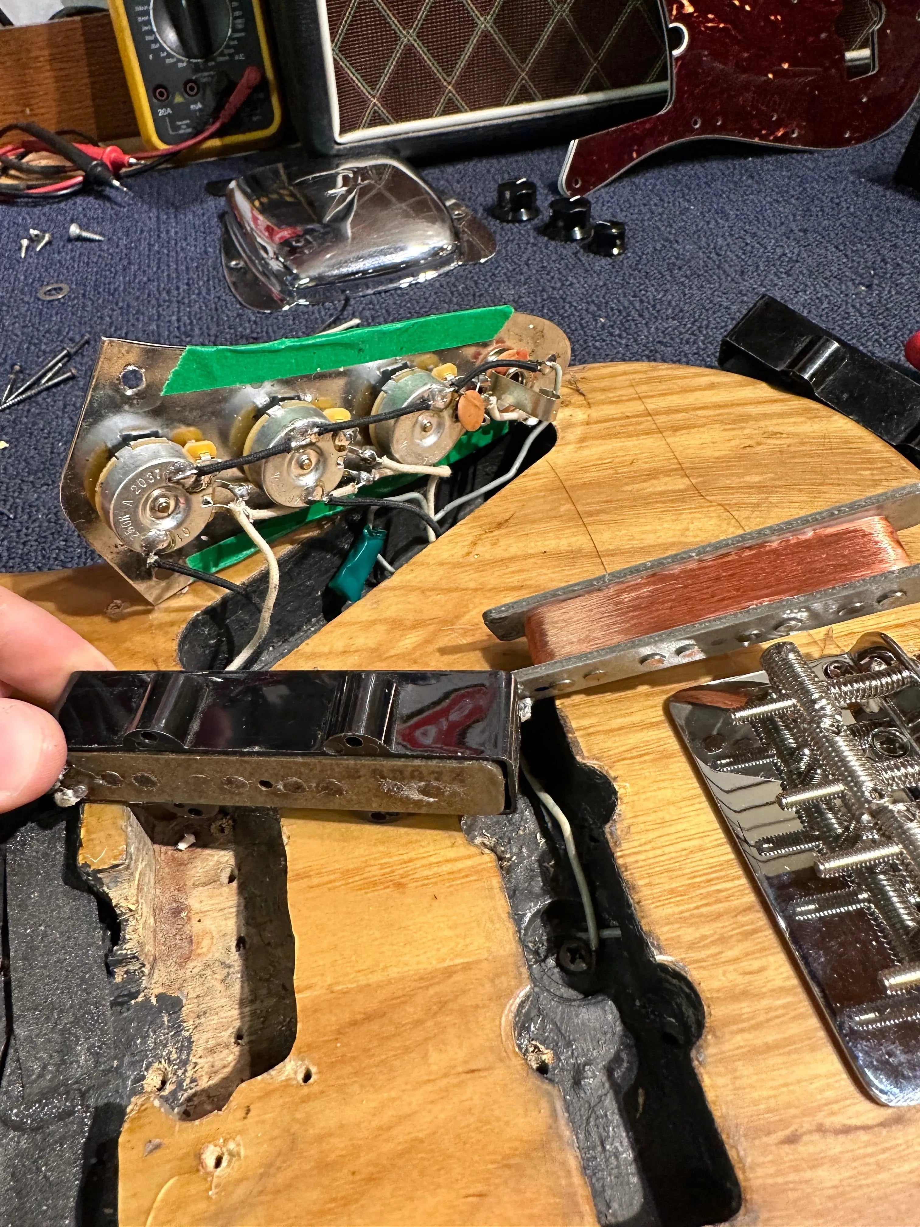 Electronics: Non-original pots, wiring, and pickups. A Fender Custom Shop pickup has installed in the bridge and a 70s Jazz Bass pickup has been installed in the neck as well as CTS 250K pots and cloth wiring.