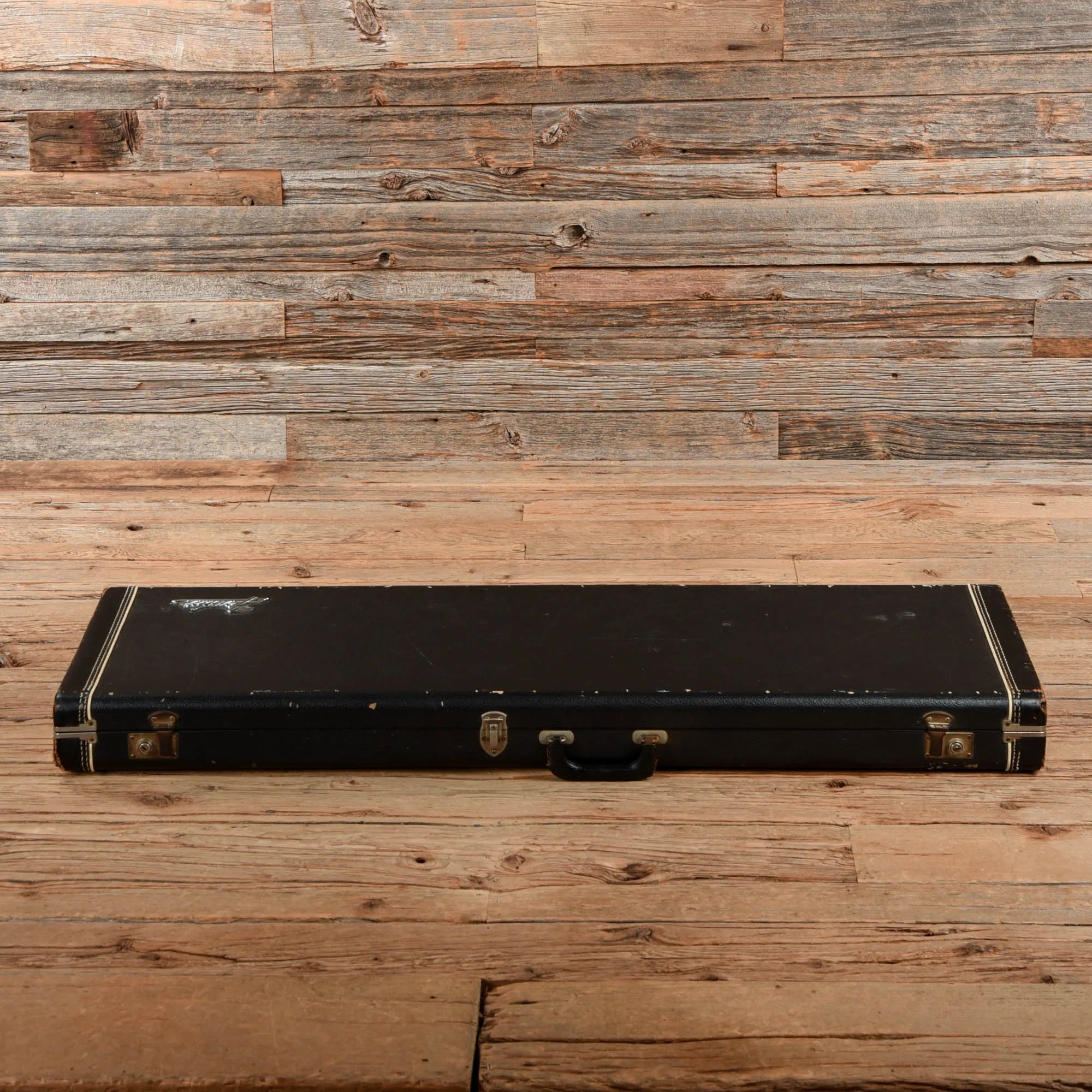 Cosmetic Condition: This vintage Fender bass is in good condition. The finish is glossy with light scratching, small finish chips, and small dings scattered throughout. The top has bare screw holes where the bridge and pickup covers had been removed, as well as two over the bridge pickup. The lower bout shows extensive finish wear along its bass side edge. The back shows some finish wear at the bevel of the bass side waist, on the edge of the upper horn, and on the lower corner of the neck joint. The headstock has what appears to be a small crack running through the G and D string tuners; this is very shallow and structurally stable and will not affect playability. The metal hardware is lightly tarnished with age.