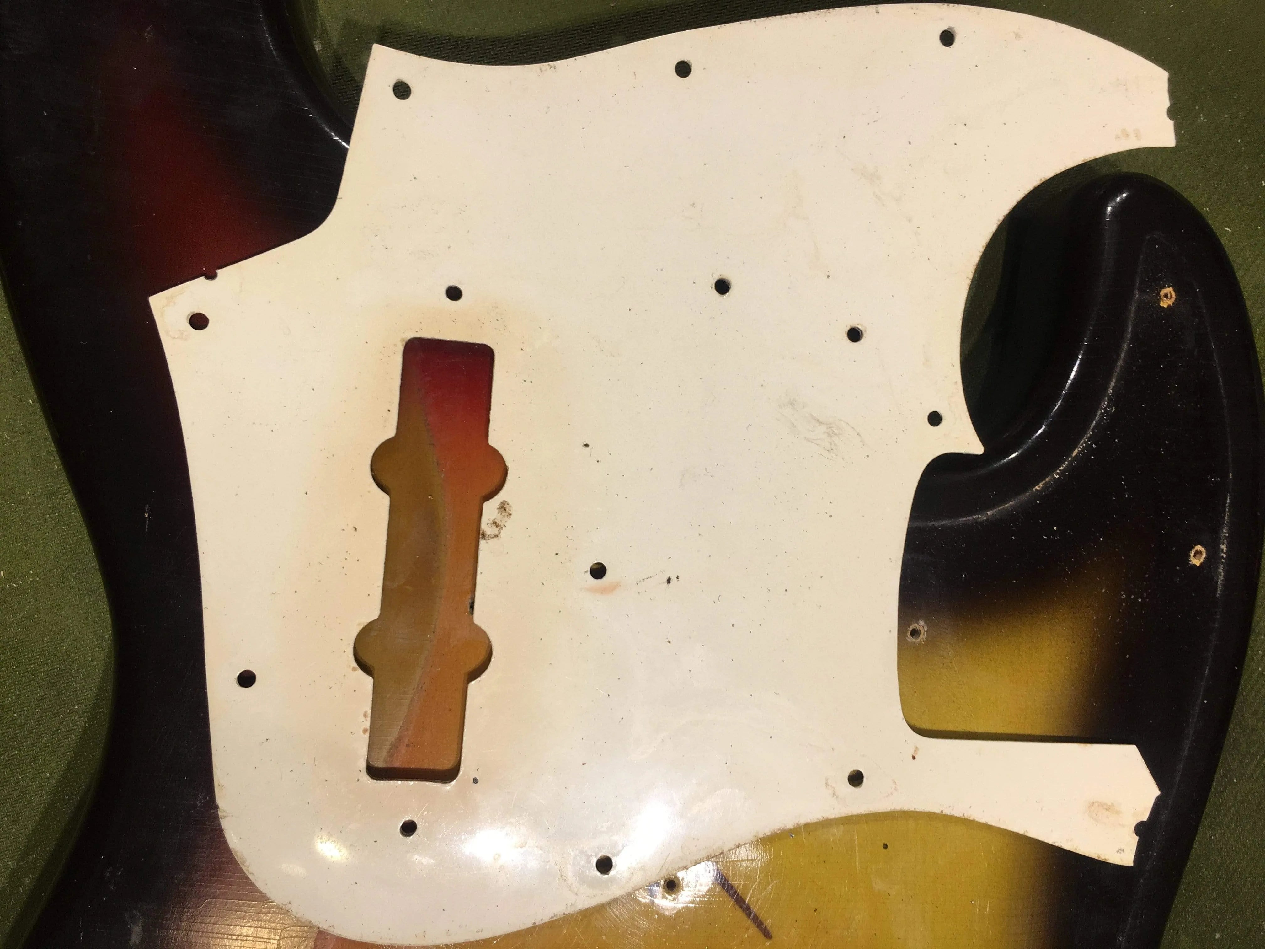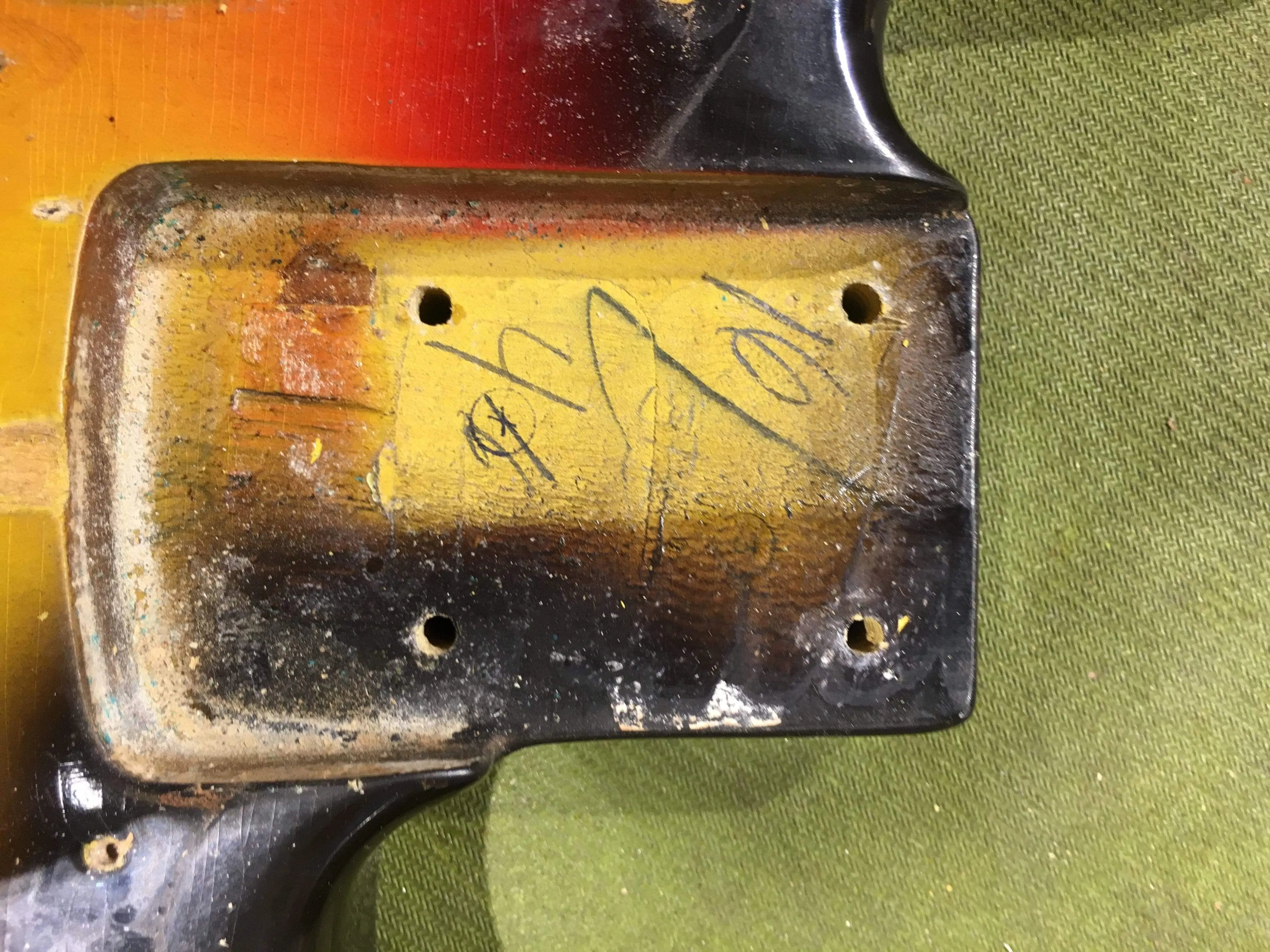 — An addition ashtray was installed between the pickups at some point leaving behind screw holes.