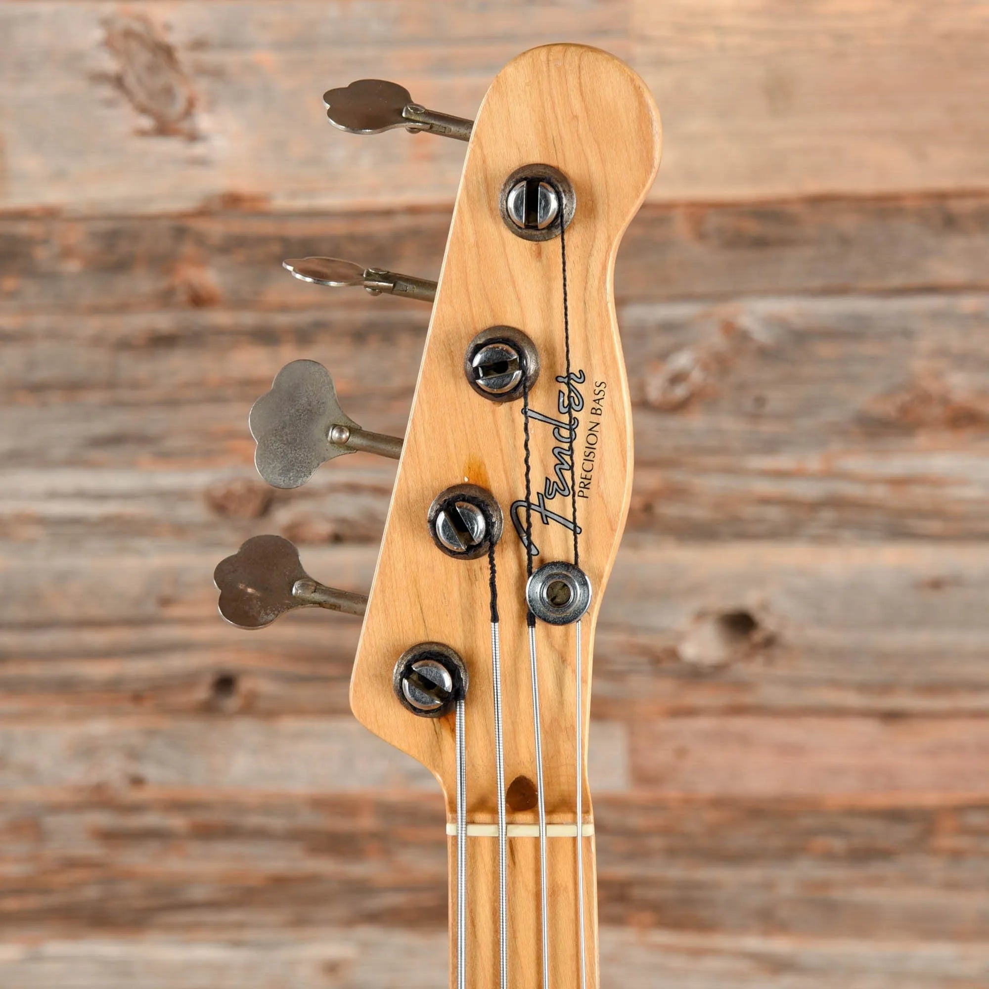Cosmetic Condition: This vintage Fender bass is in good cosmetic condition; the refinished body and neck are in clean condition with various light marks, scratches, and chips. There are some heavier finish chips along the treble side of the body, and the back of the neck has a couple small dings. The headstock face has some light checking around the tuners and on the back, and there are spots at the A and D tuners which have been filled with epoxy.