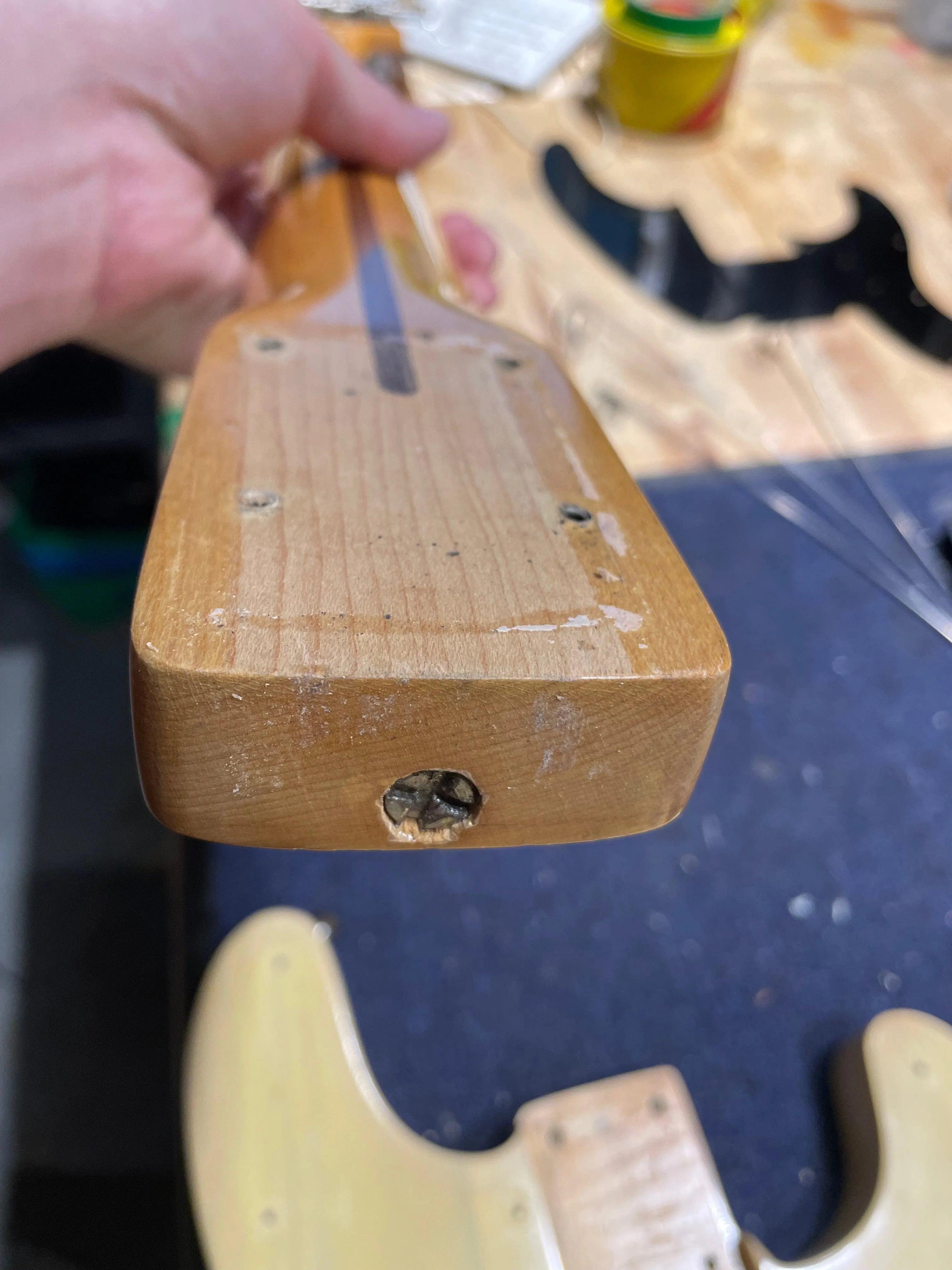 Neck Details: One piece maple bolt-on neck with skunk stripe and maple fingerboard. “Tadeo” and a 1953 date is penciled in the neck pocket. The neck heel itself does not have a pencil date.