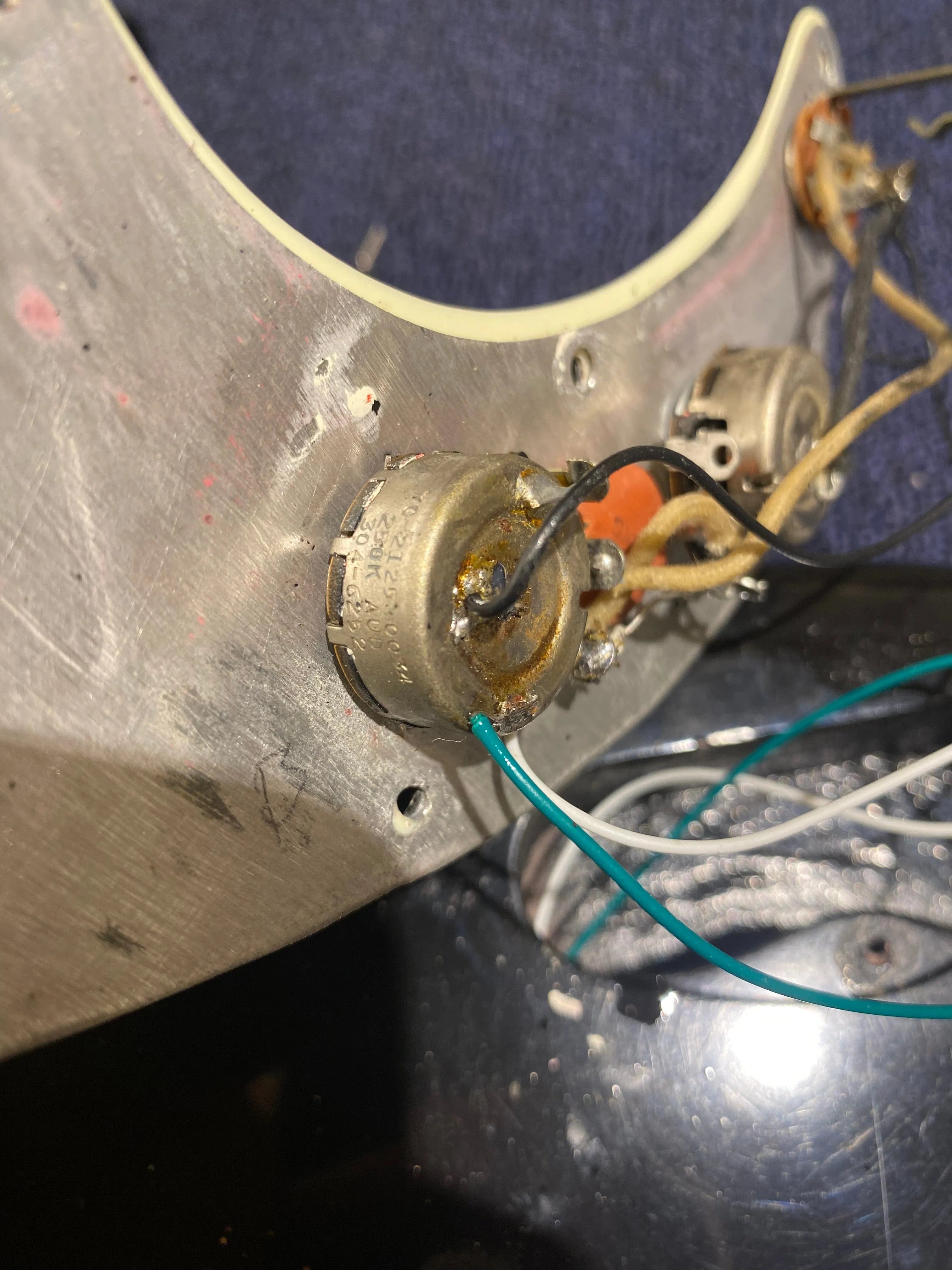 Electronics: Original; Split-coil pickup, master volume, master tone. The pickup leads have been lengthened with extra wire. Pot codes date to 1962