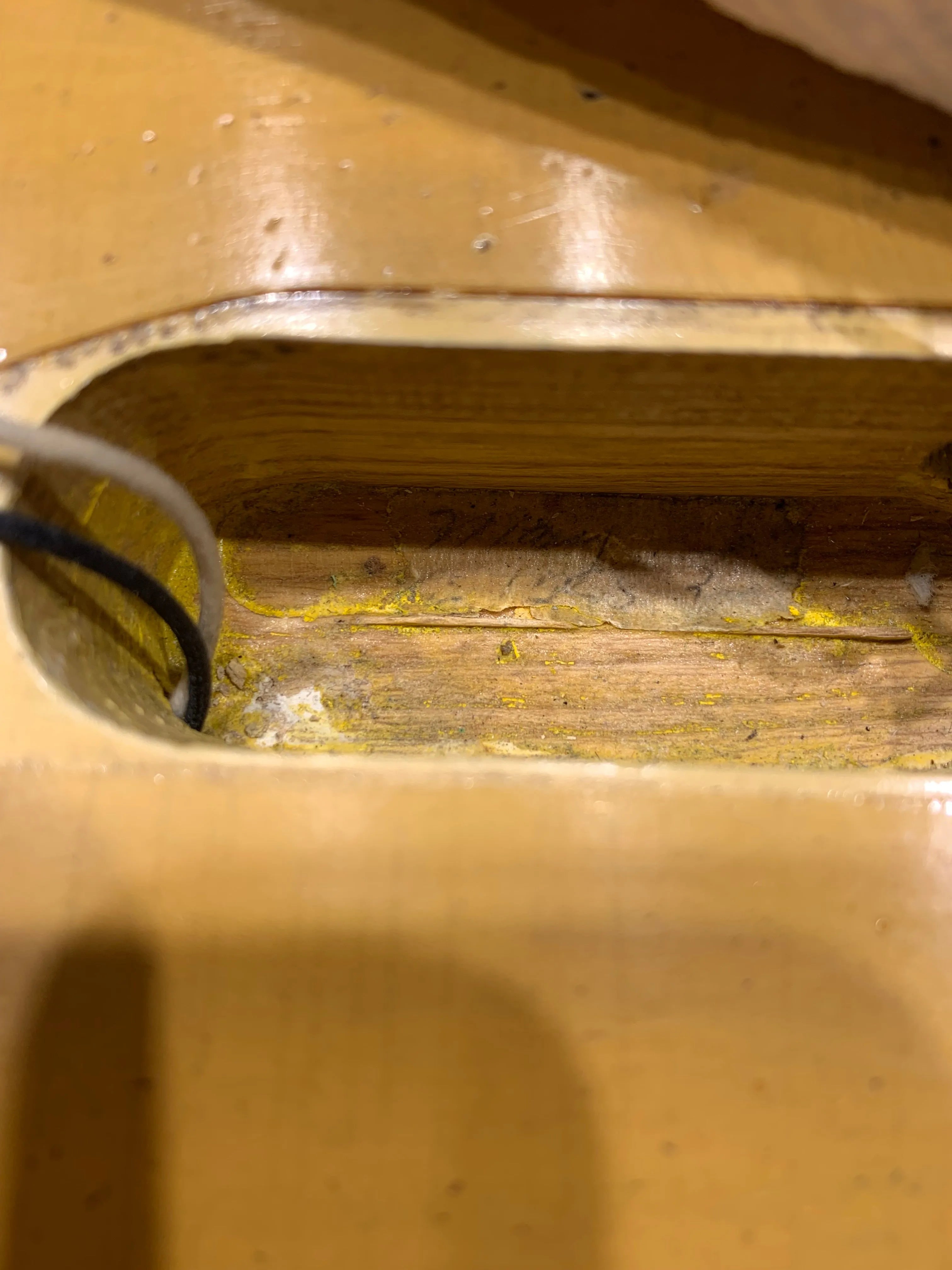 Electronics: The pickup is an original single coil pickup with black bobbin, but has been rewound. The wiring harness is original, with master volume and tone controls; the pot codes have worn away, but the components are appropriate to this era.