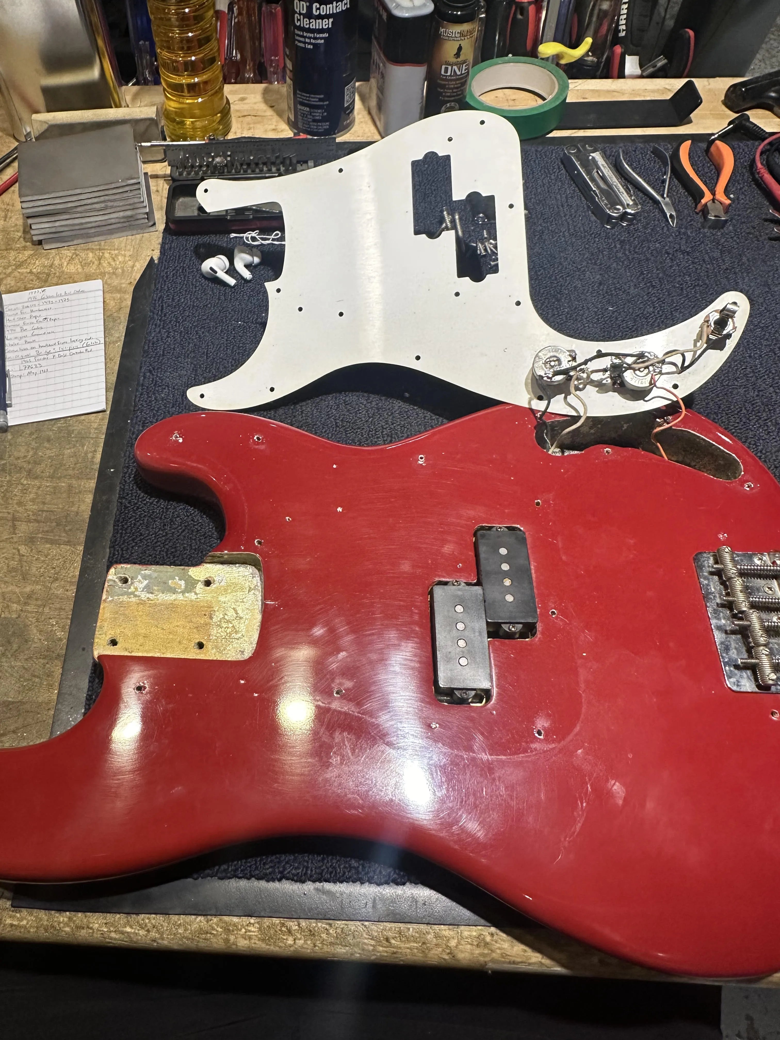 Hardware: Original. The thumb rest, bridge cover, and pickup cover are not included with the bass. The pickguard is not original.