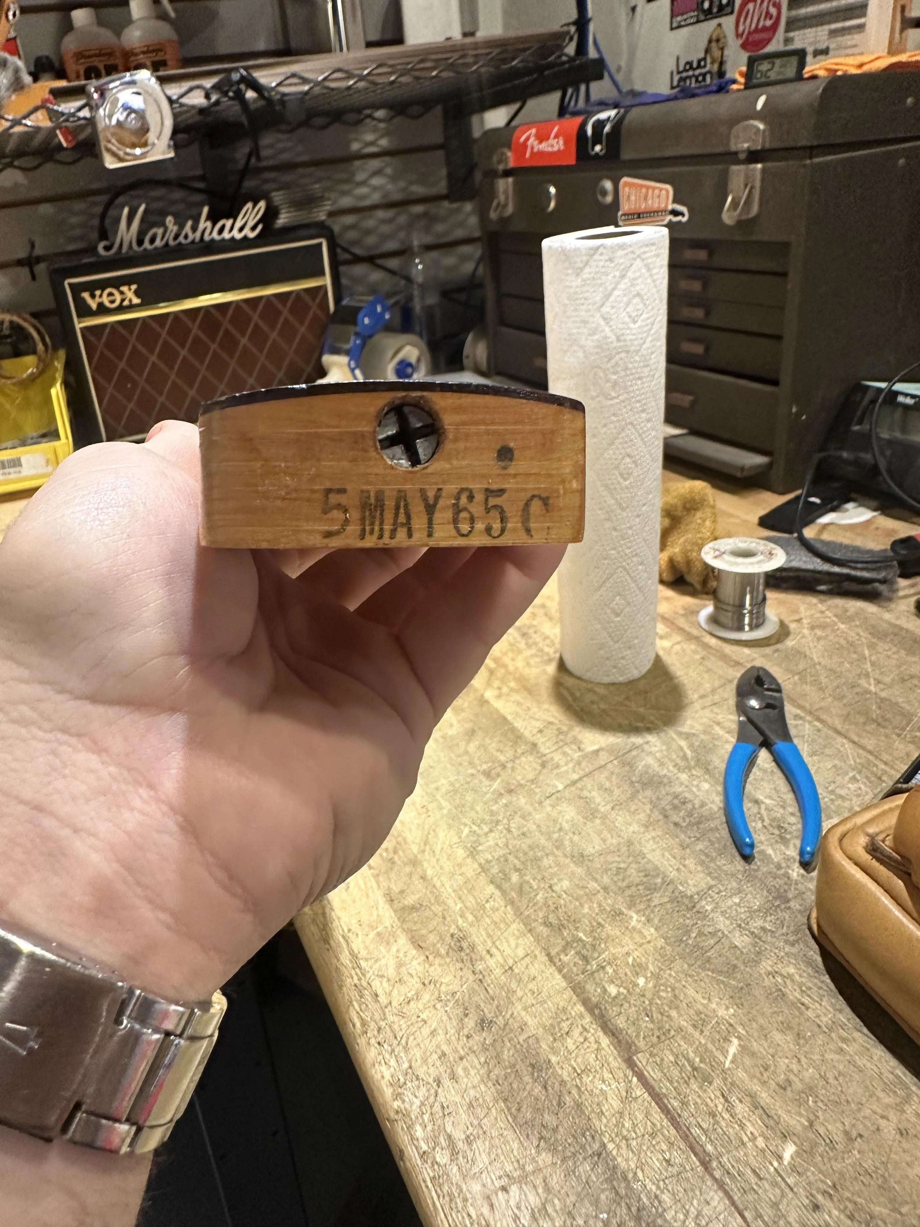 Electronics: Non-original volume and tone pots. The output jack is not original as well. The pickup does appear to be original with “65” written on the bobbin.