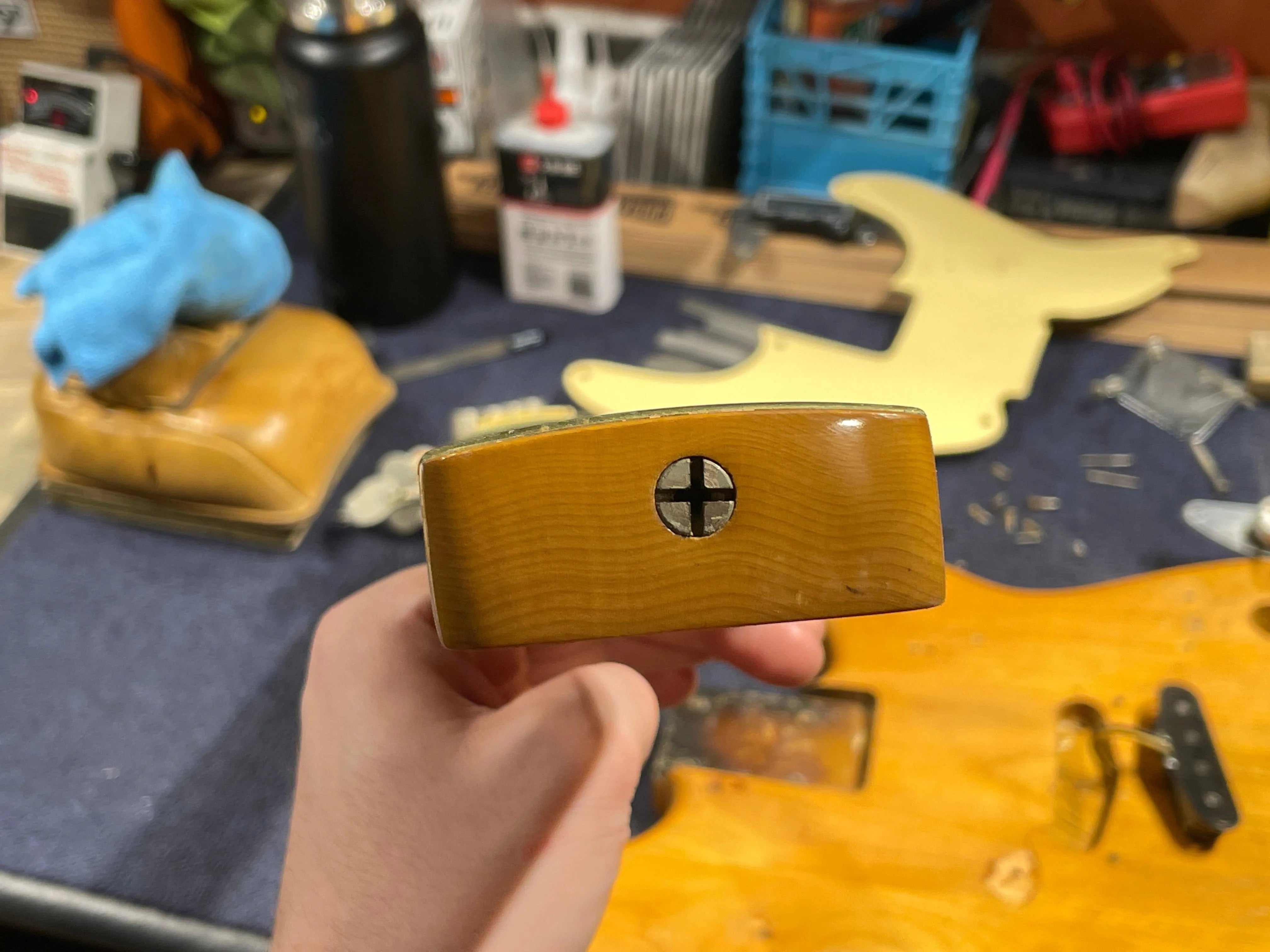 Hardware: Original hardware with replaced strap buttons. The bridge and pickup covers have been removed and are missing. The tuners are original to the neck. The pickguard is non original