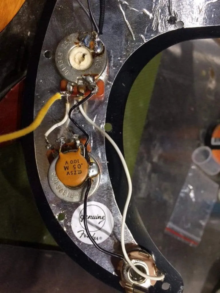 Modifications/Repairs: Replaced pickup leads — Replaced output jack — Touched up solder joint connections — Non-original pickguard —