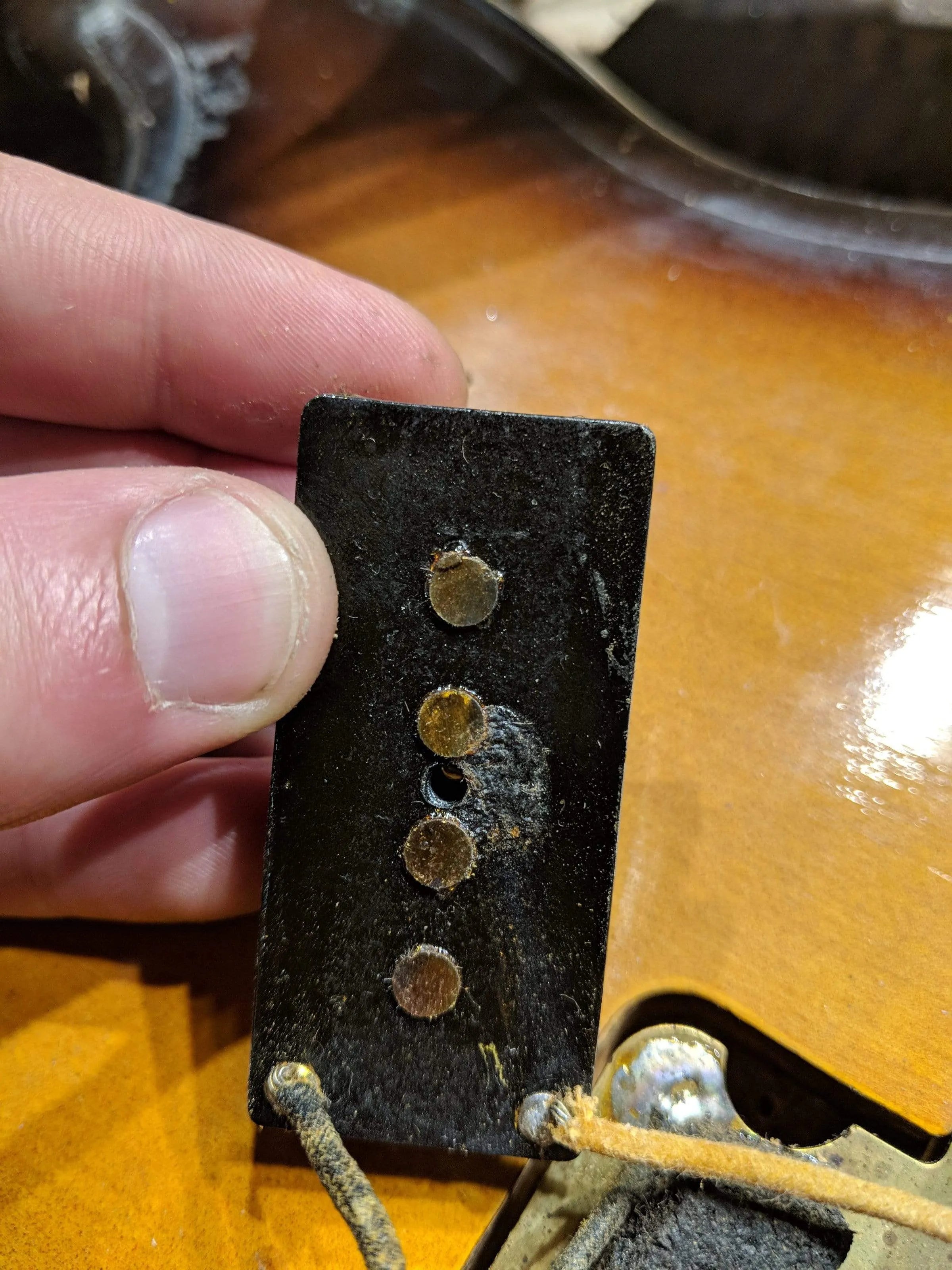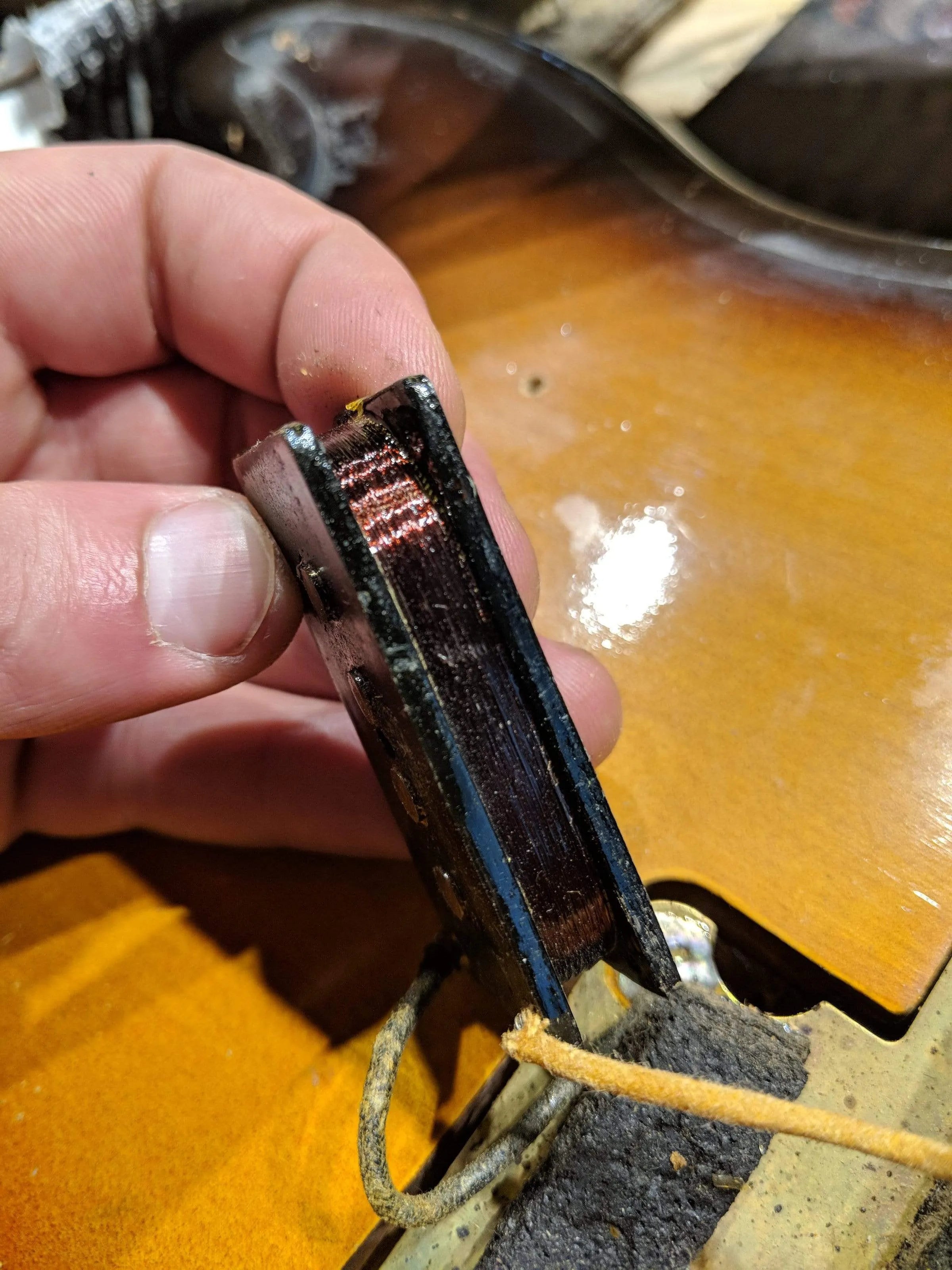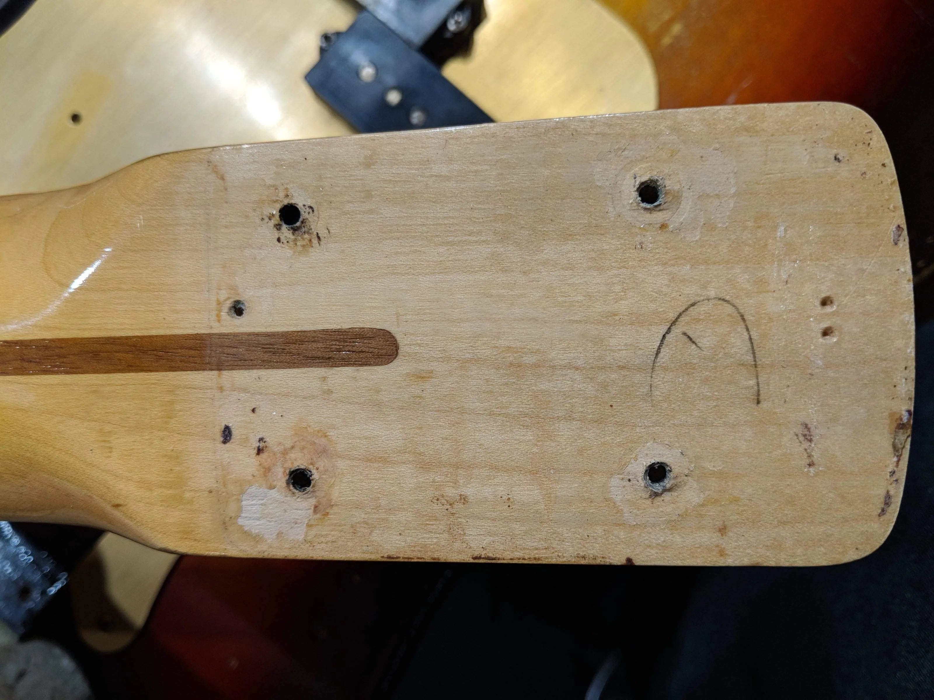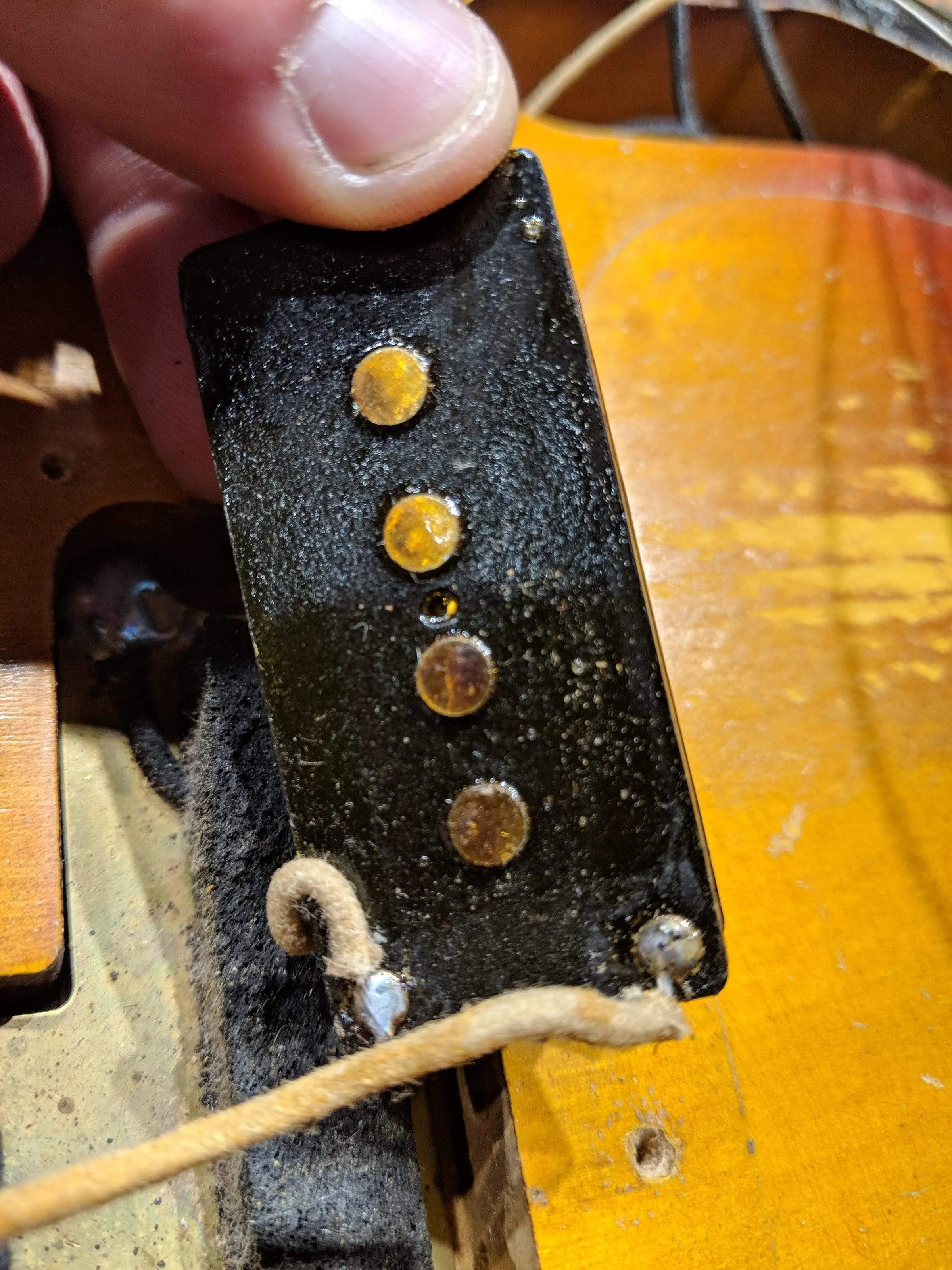 -An area of wood near the output jack broke and was re-glued. This repair is structurally secure with some cosmetic damage.