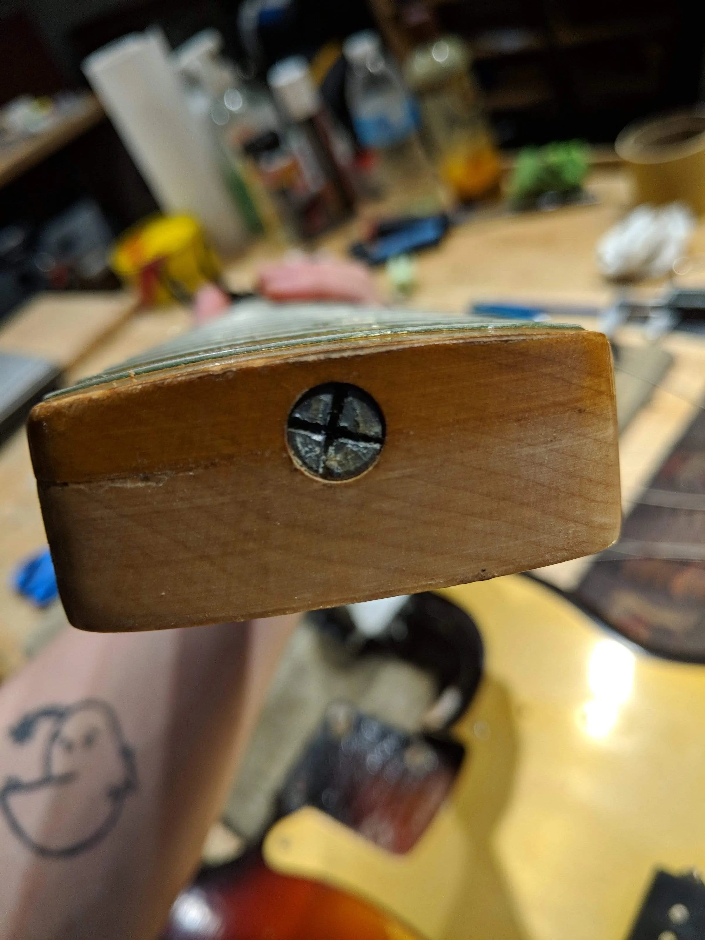 Hardware: G string tuner has been replaced, it has a gold gear and flathead screw.