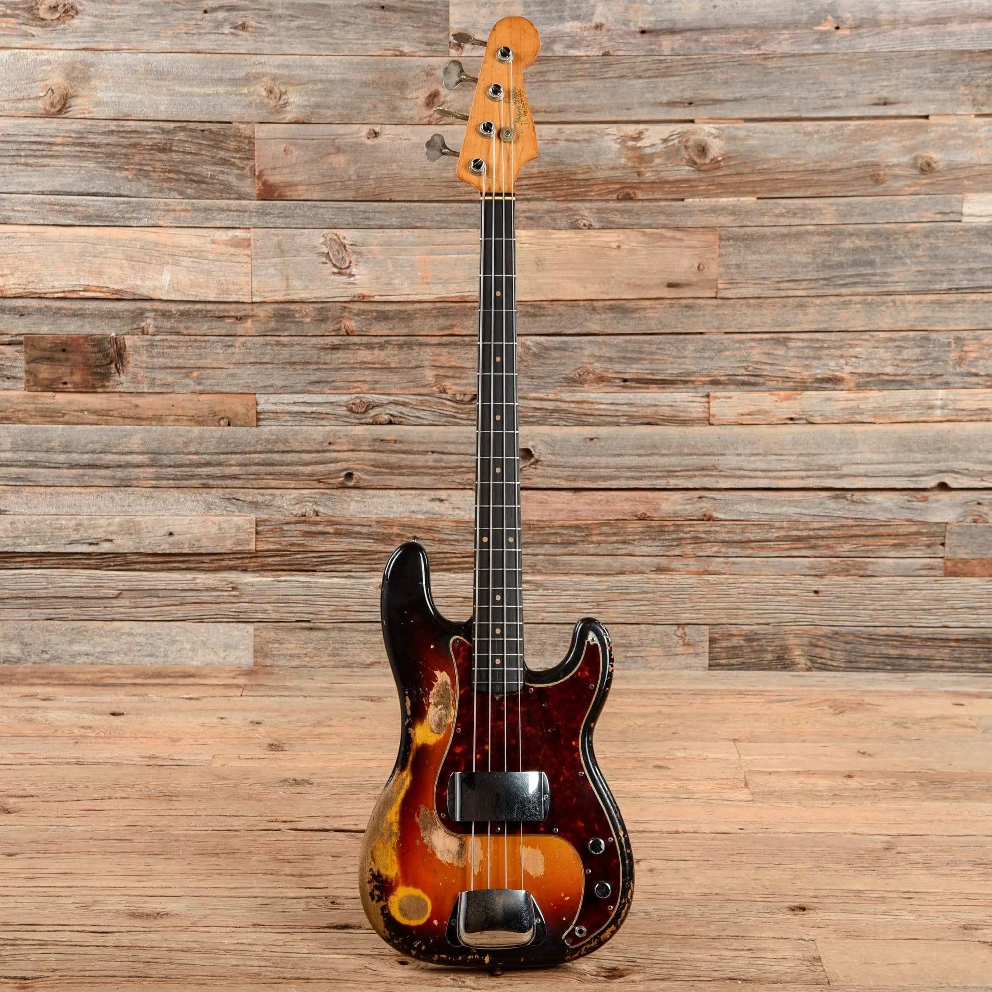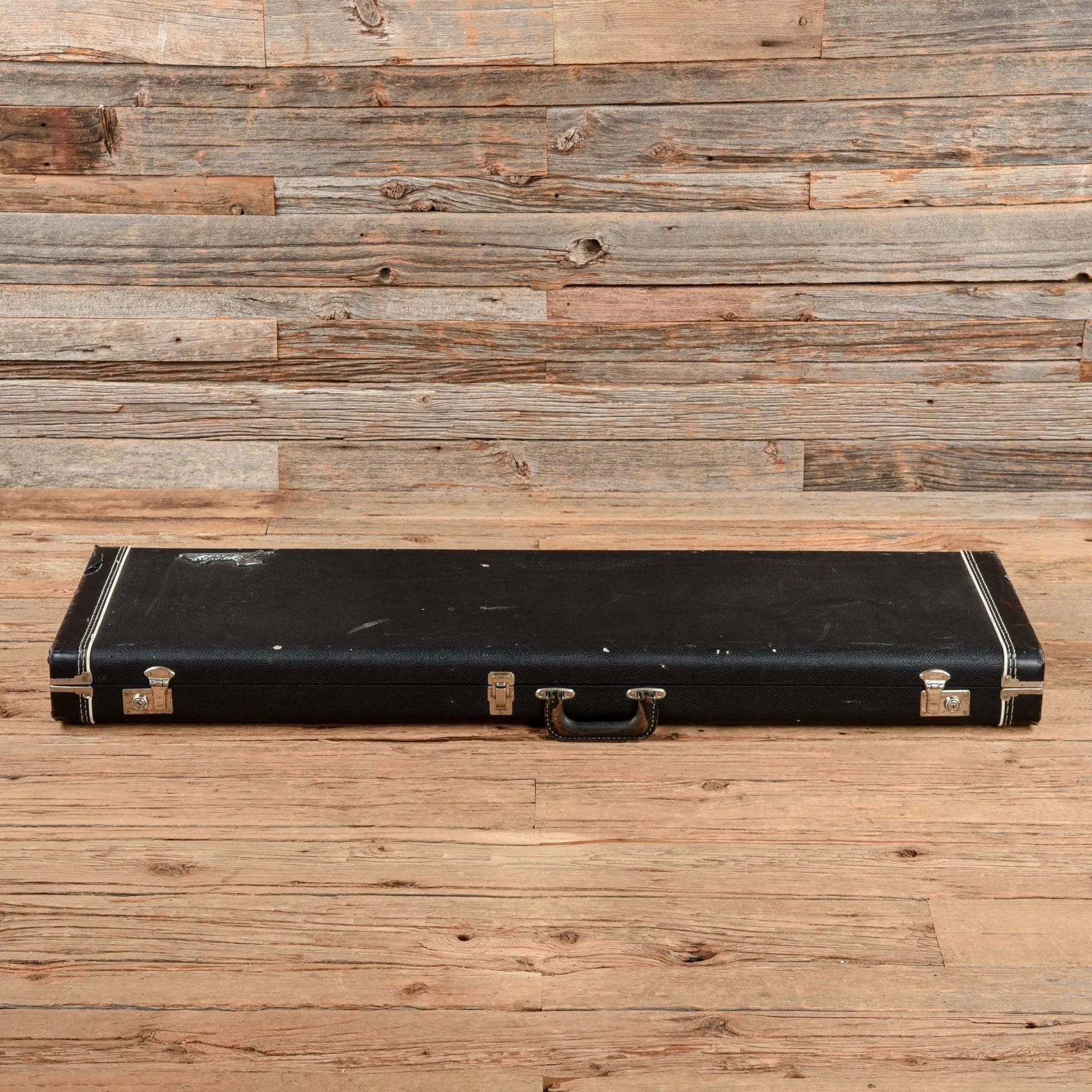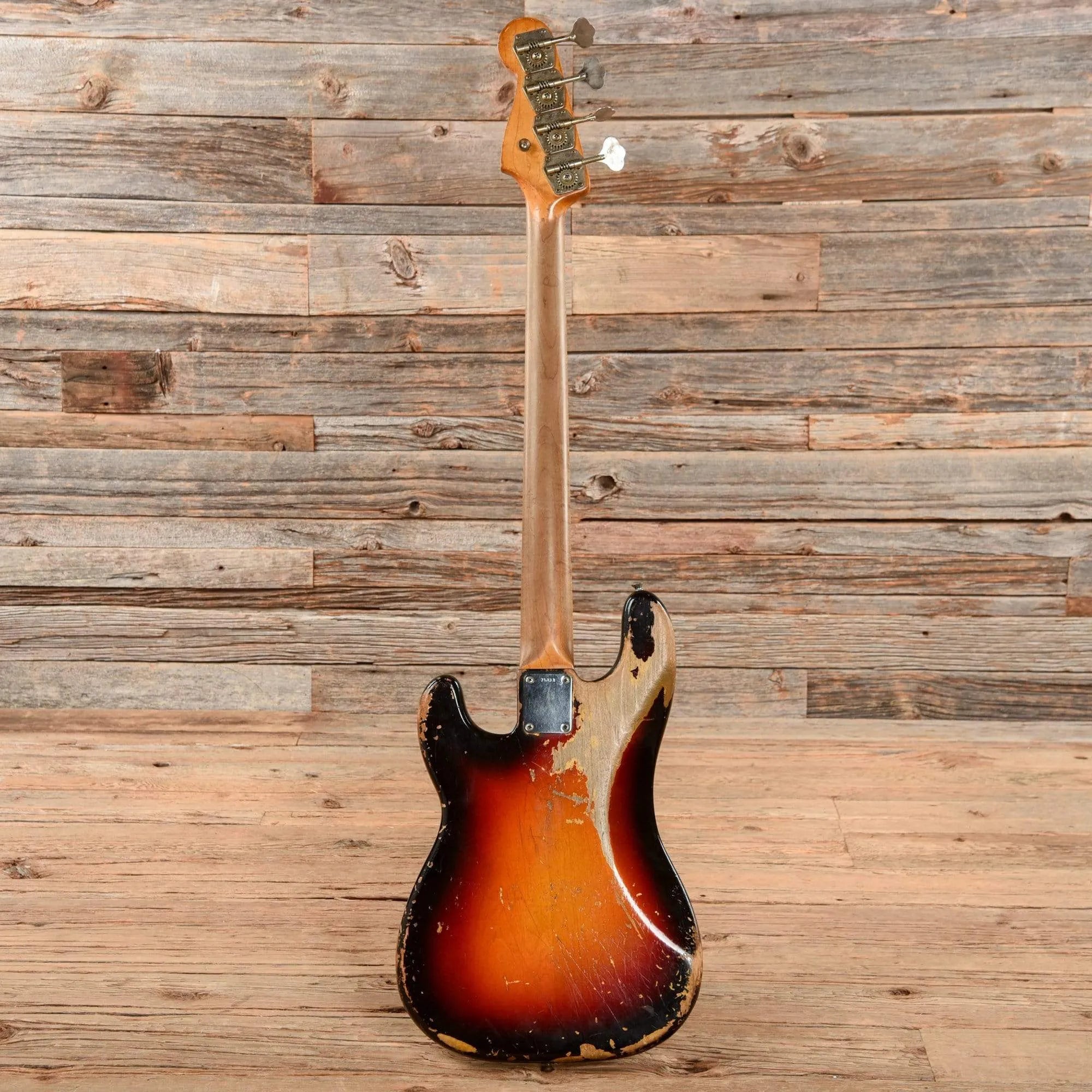 Cosmetic Condition: The bass shows plenty of nice aging, with heavy finish wear on the body and back of the neck. There is heavy wear under the strings between the pickguard bridge, which has worn into the wood. The sides and edges of the body have heavy finish wear as well, and the wood has chipped slightly at the bass bout. The back of the body has heavy wear, buckle rash, and several large scratches. The pickguard has cracked at the treble horn and the output jack, but the metal shield is intact. The back of the neck has worn to a smooth and comfortable satin finish.