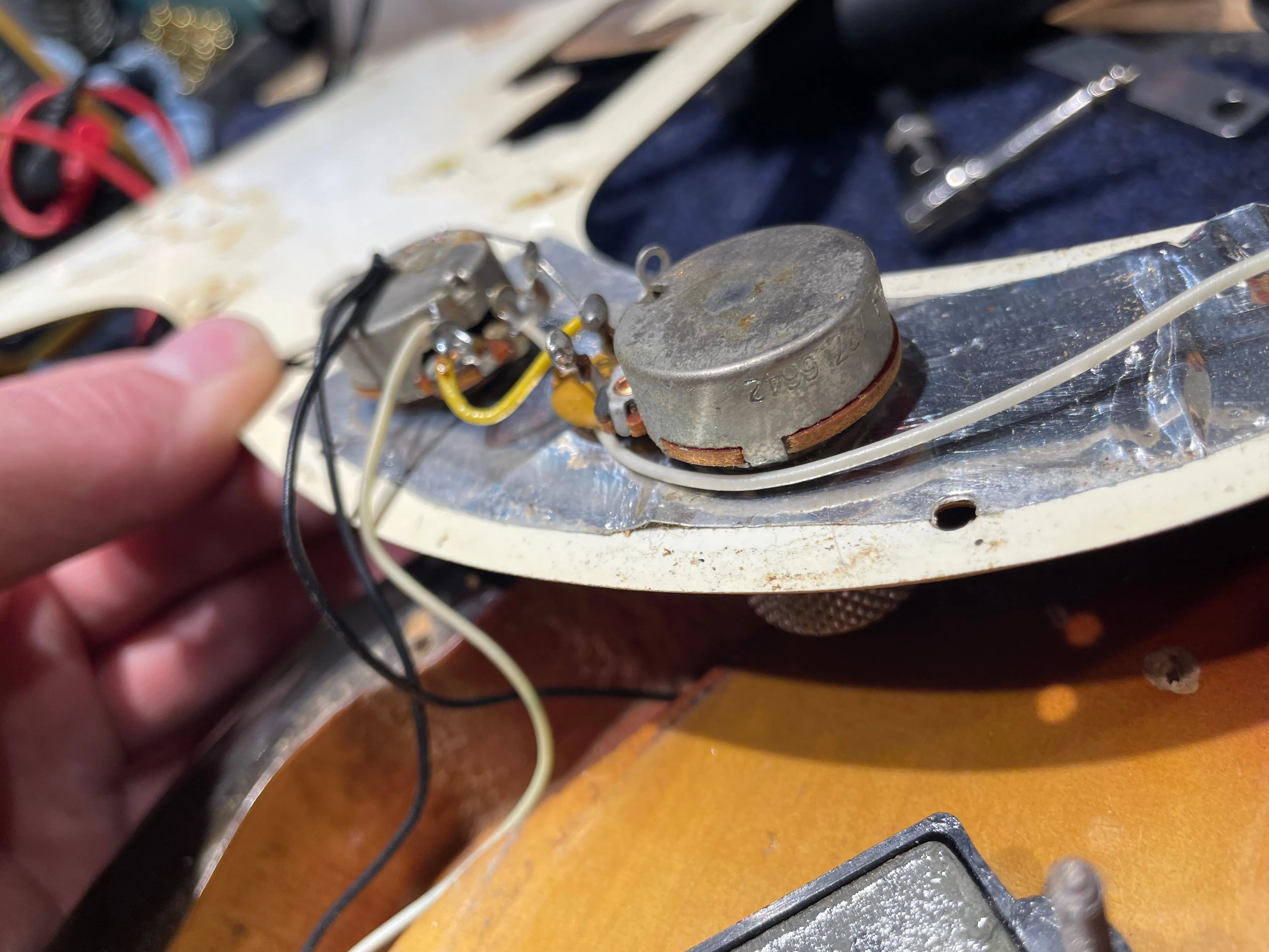 Electronics: Original split single coil pickup with grey bobbin, and original wiring harness with volume and tone controls. The pot codes date to 1966.