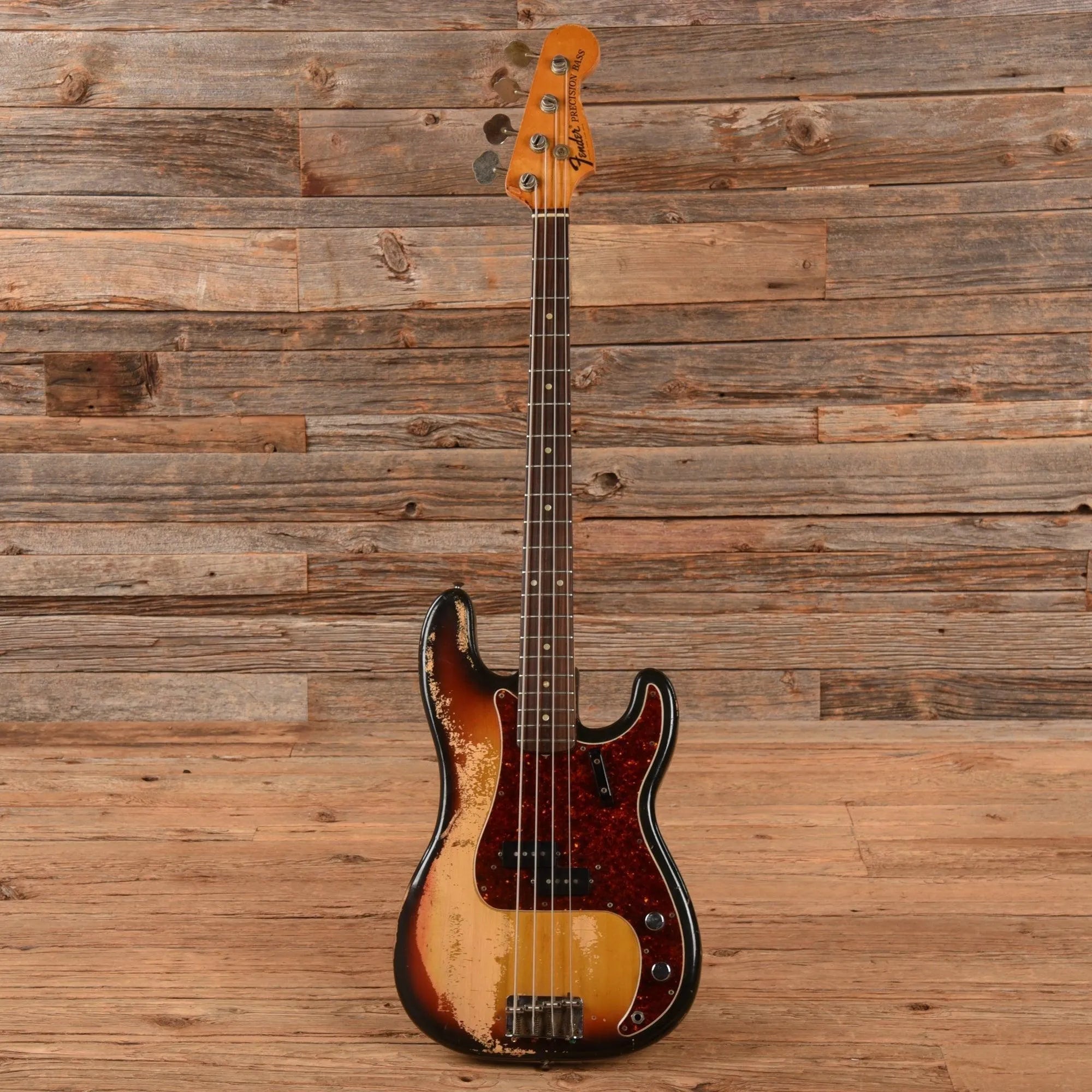Cosmetic Condition: This vintage Fender bass has heavy aging present, with significant wear and chipping to the body finish. Most of this wear is on the front of the body, and the back has smaller patches of wear, buckle rash, and a coil-cable imprint. The back of the neck is glossy and smooth, with a few patches of wear. There is some finish wear around the edges of the headstock, and the hardware is nicely tarnished.