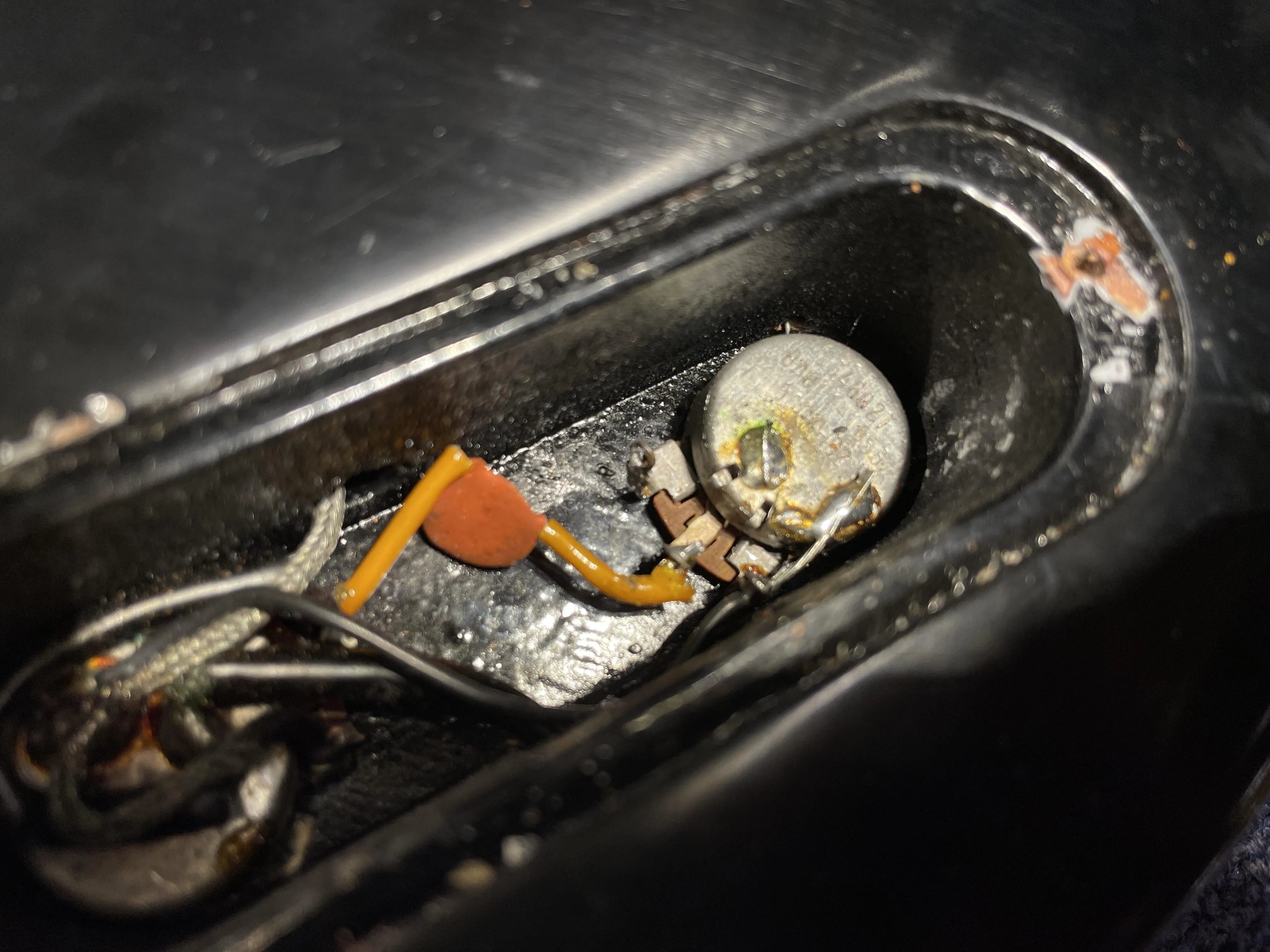 Electronics: Original electronics; one single coil pickup, tone, and volume control.