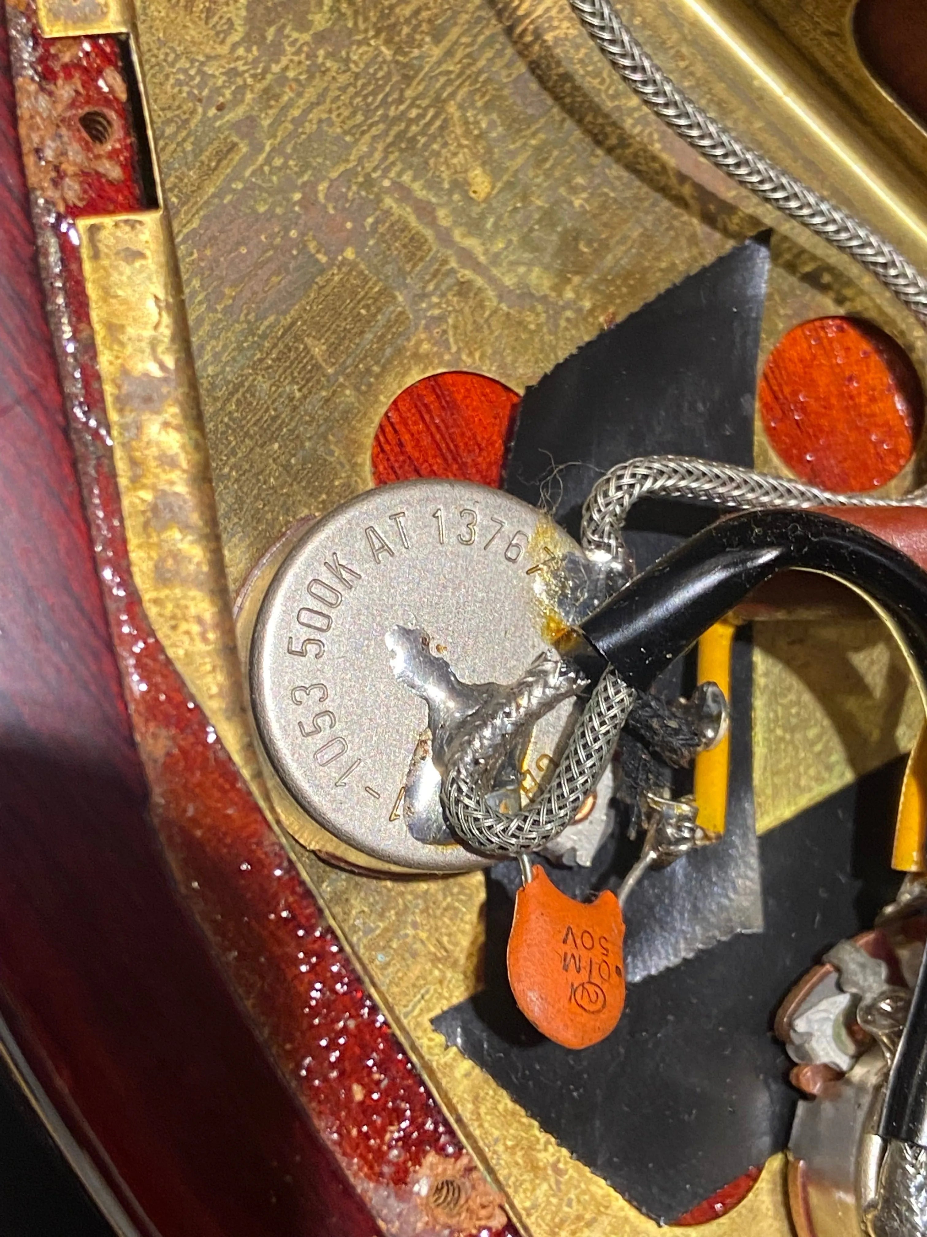Electronics: The electronics appear original. One era EB pickup with volume and tone controls. The pot codes date to 1967, and all components are era correct. The solder joints appear untouched.