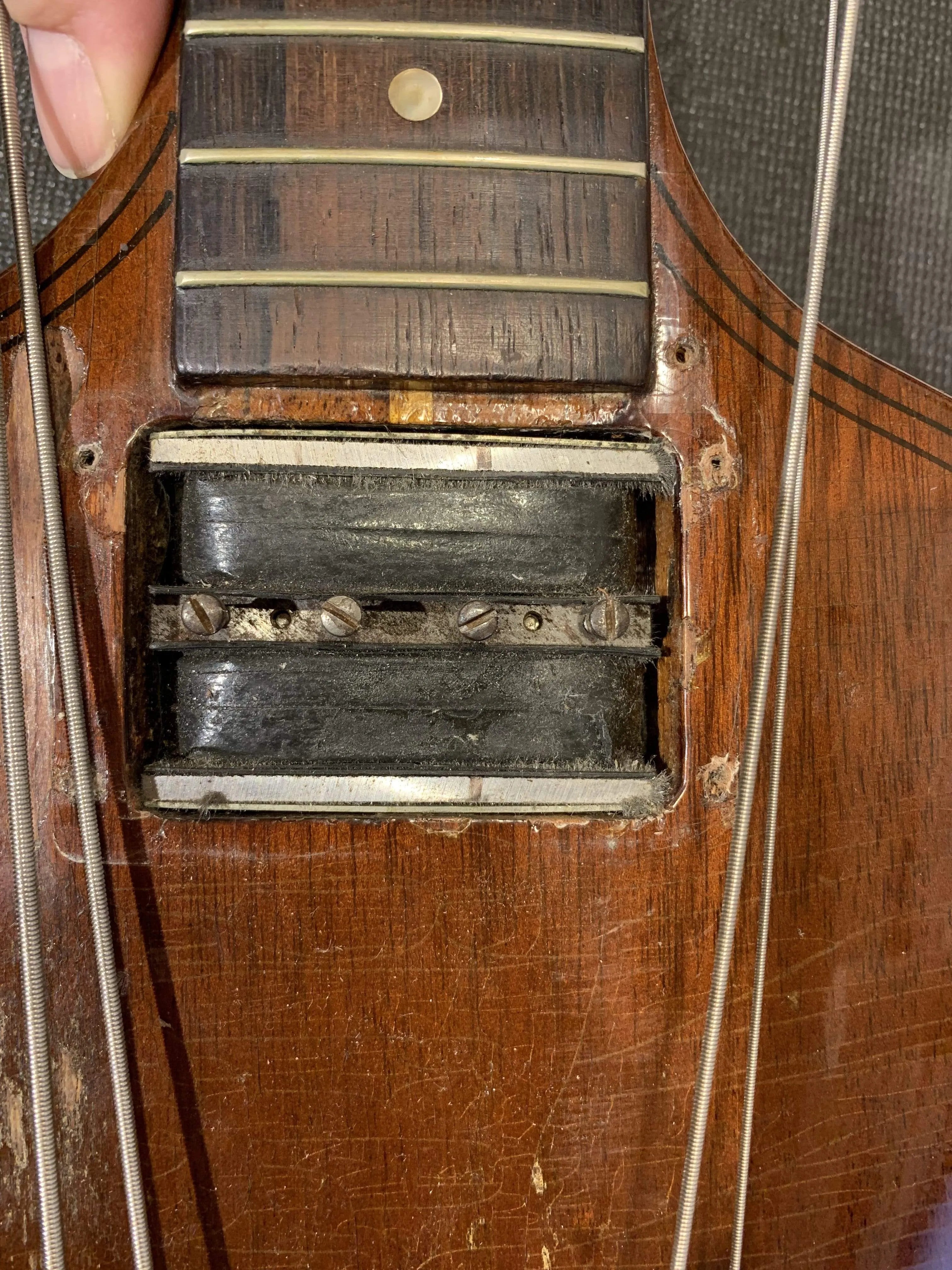 Tech Notes: Plays well with low action; the frets are narrow and fairly low with minor wear, and the bass plays cleanly in this condition. The truss rod is adjustable in both directions. The original inked serial number on the back of the headstock has faded; the pot codes and appointments date the instrument to 1961.