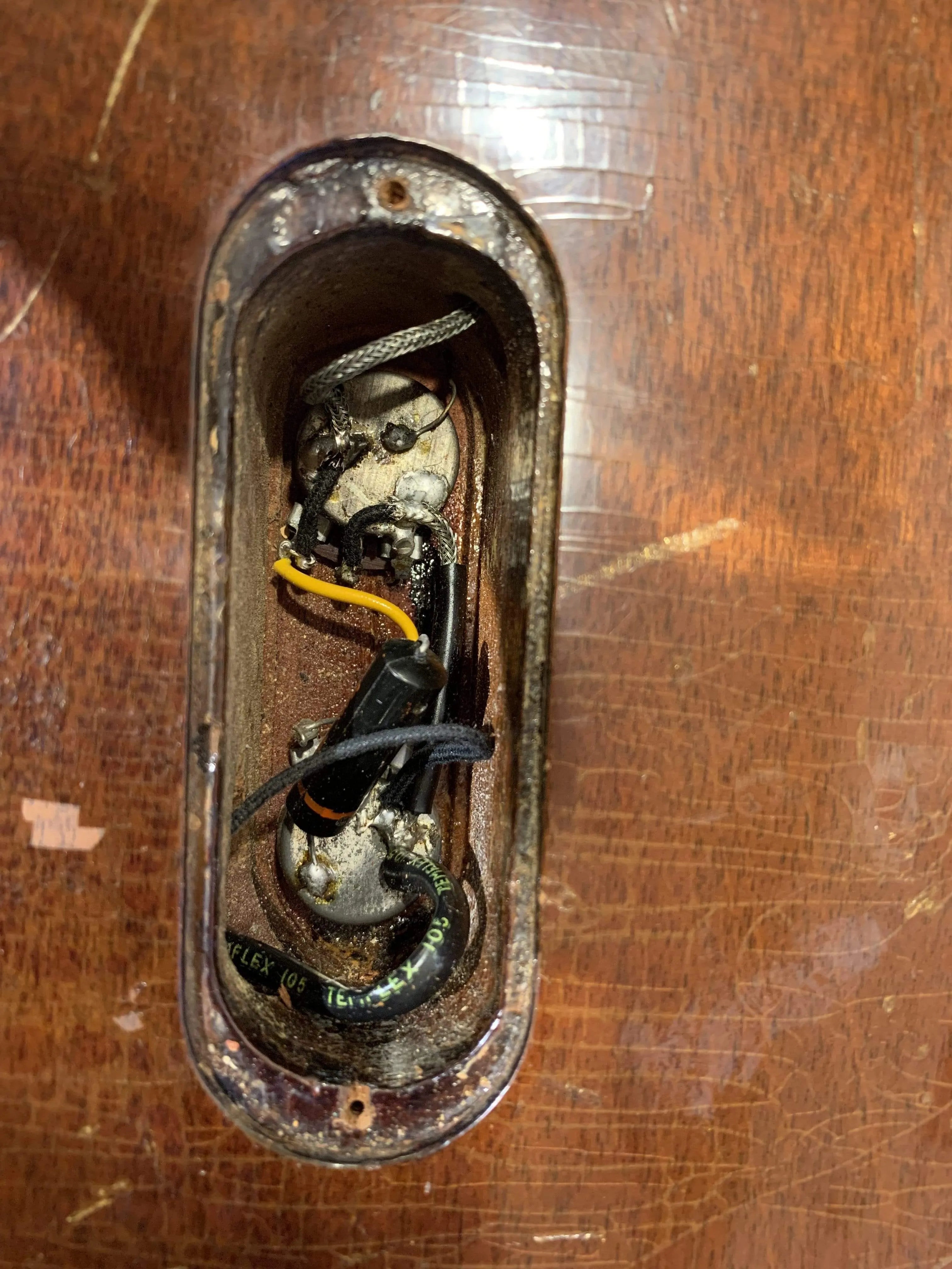 Electronics: Original humbucker pickup with center pole pieces and black plastic cover, and original wiring harness with master volume/tone controls. Some solder joints appear to have been touched up. The pots were made by Centralab, and date to 1961.