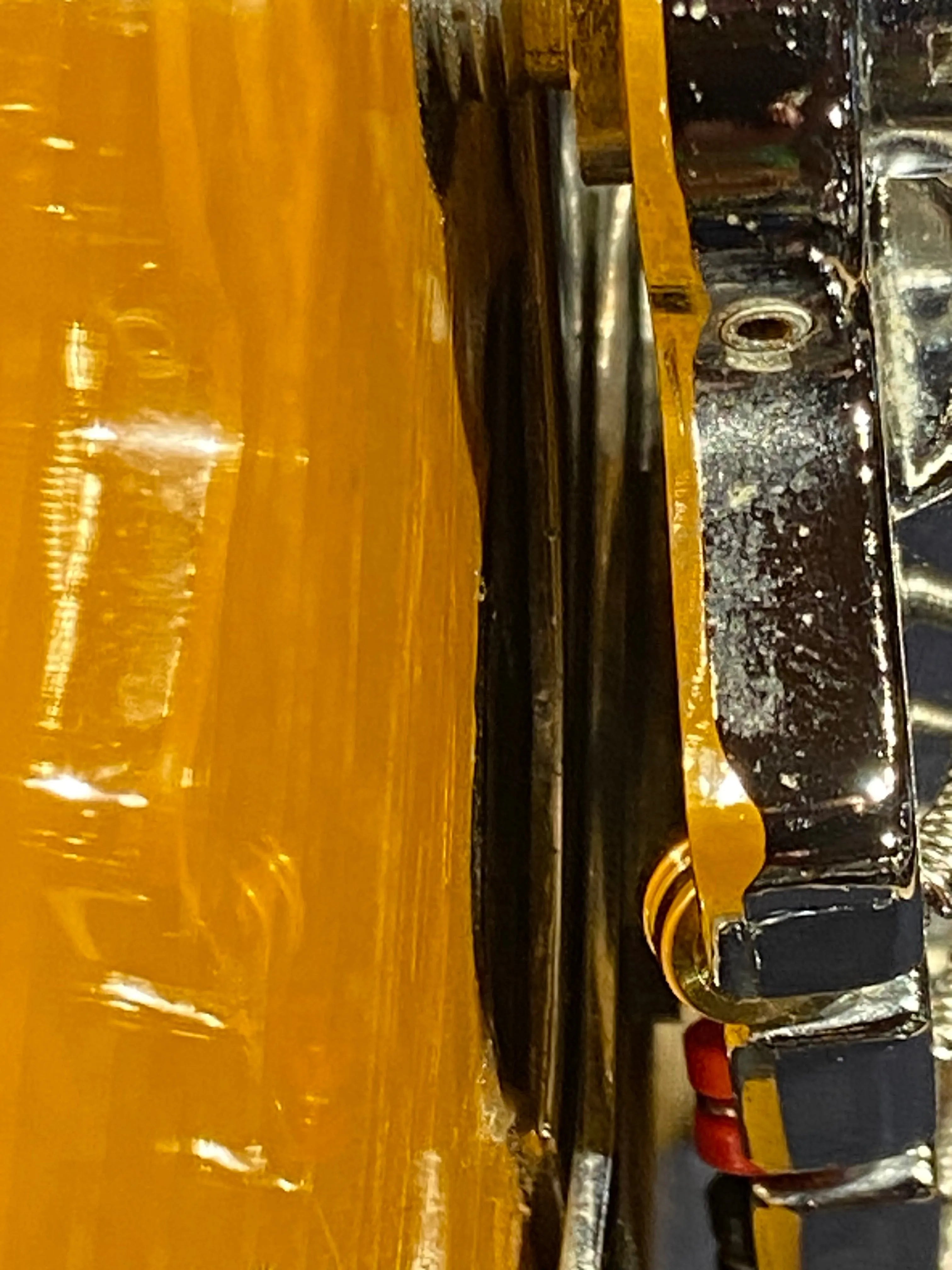 Modifications/Repairs: A small piece of plastic has been grafted into the top under the tailpiece for support for the mute. There are some filled finish chips under the D string tuner on the back of the headstock. The last three frets have been leveled.