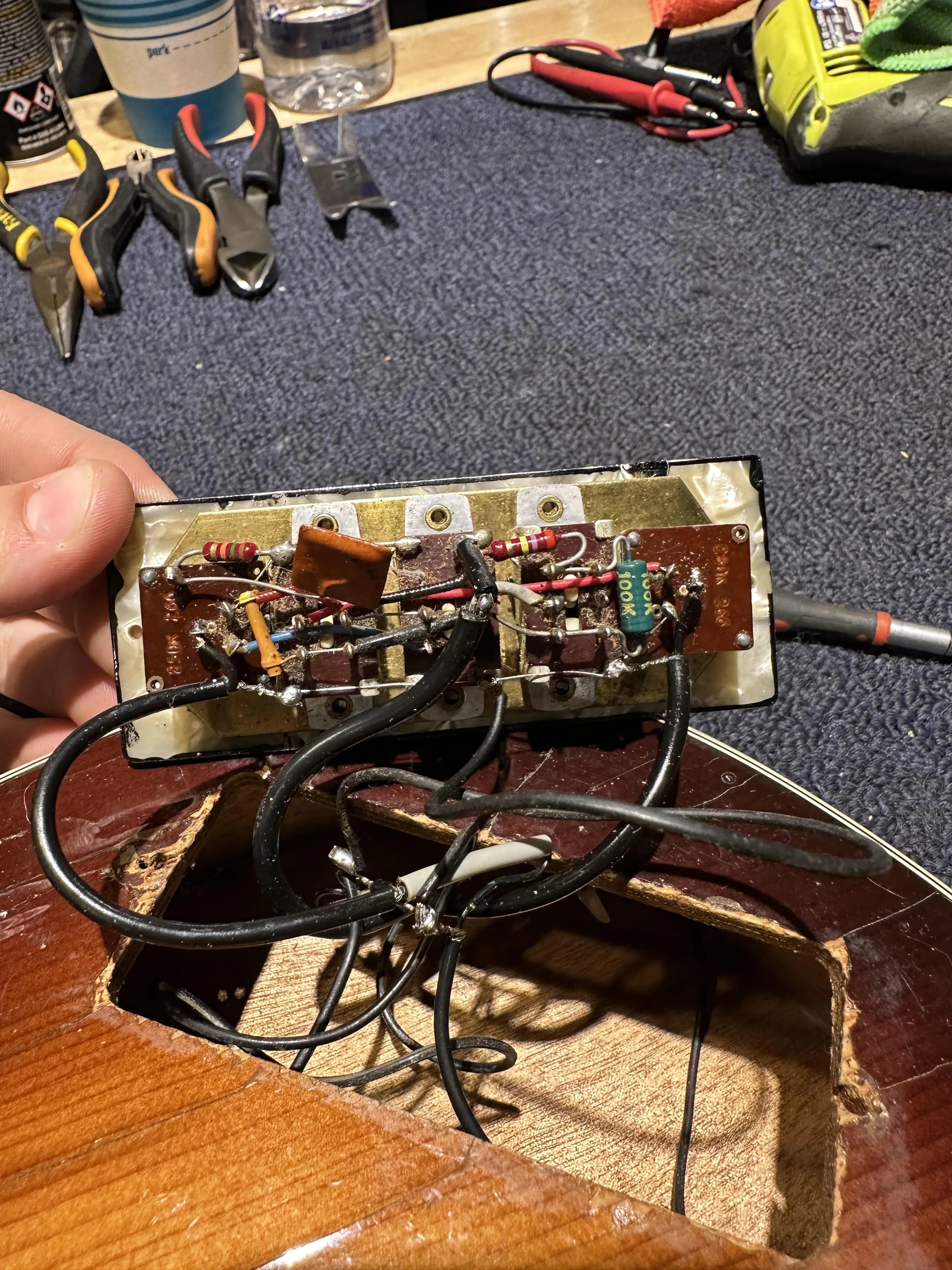 Electronics: Original pickups with two volume pots and pickup switches. The codes on the electronics panel display 1966 dates.