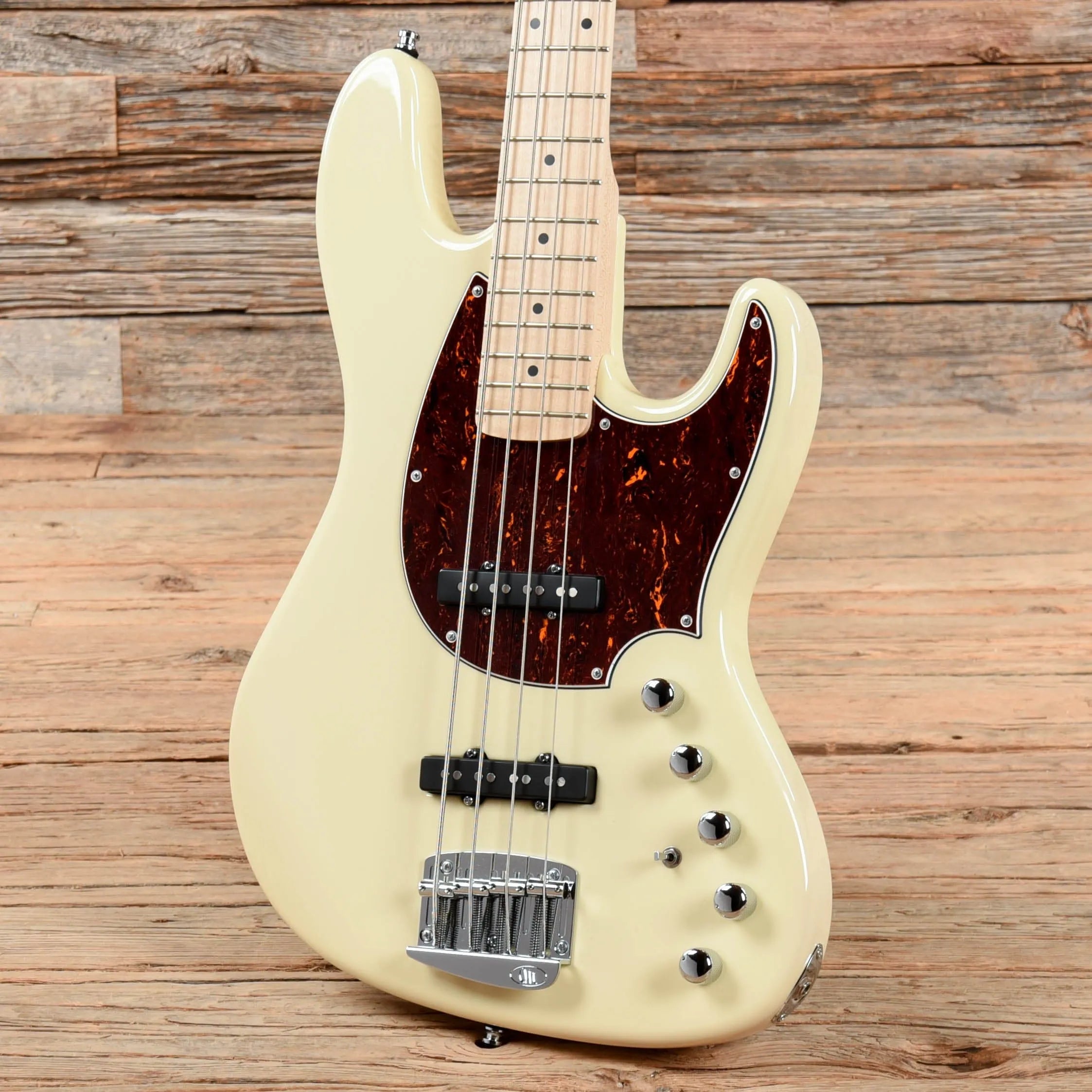 Electronics: Original Aguilar single-coil pickups and active Mayones preamp. Controls include a master volume pot, pickup blend pot, 2-band eq, tone pot, and preamp bypass switch.