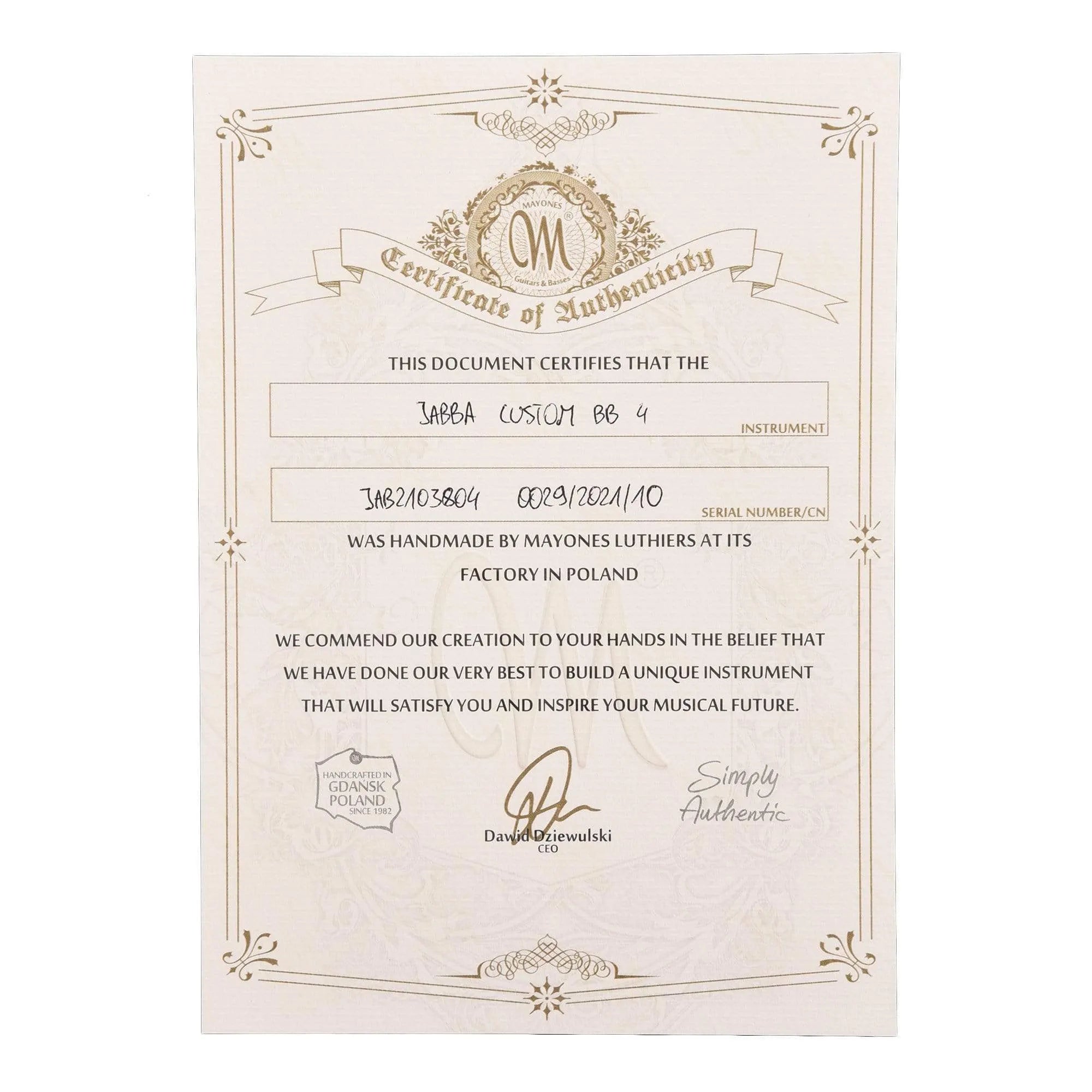 This Jabba Custom BB 4 Bass features a Swamp Ash body with Buckeye Burl top and Aguilar 4J-70 pickups.