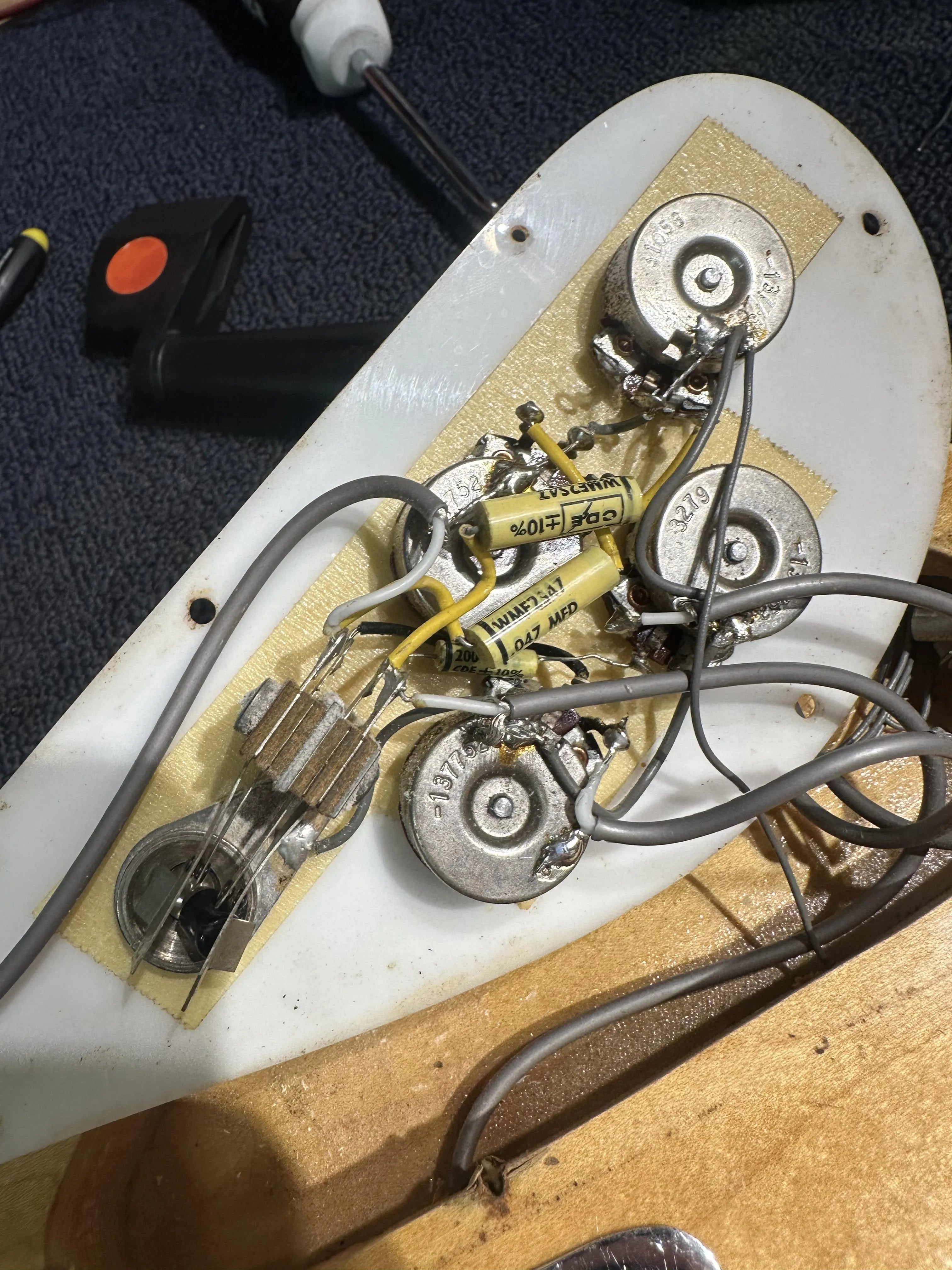Electronics: Original pickups, wiring, and pots. A few solder joints have been touched up. The pot codes date to 1975.