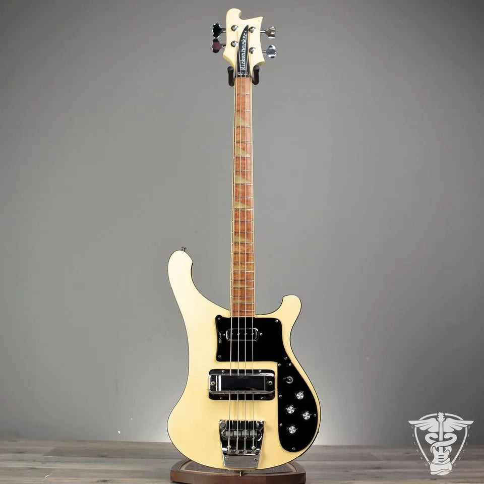 Condition Notes: Player’s Grade Finish checking throughout. Neck/Headstock: Finish clouding on neck. A few tiny finish chips around headstock – some painted over. Finish chips/wear on treble side of neck. Tiny surface cracks (cosmetic) in neck binding. Body: Areas of discoloration. Finish cracks in upper cutaways. Buckle rash and other scratches on back. Lacquer chips and small dings throughout. High action. Brand: Rickenbacker Model: Model 4003 Year: Serial: 105 Color: Aged White Weight: 9.79 lbs