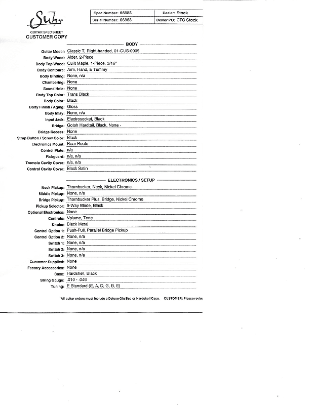 This is a 2022 Suhr Classic T Custom in excellent condition. No scratches, or dings on the guitar. The frets are like new. Adorned with an amazing 1-piece quilt maple top over a 2-piece alder body. This guitar is very comfortable to play with its stomach cut, and forearm cut. Note: This guitar has been changed from the original Pete Thorn wiring to a 3-way blade switch with a push pull coil split for the neck pickup.